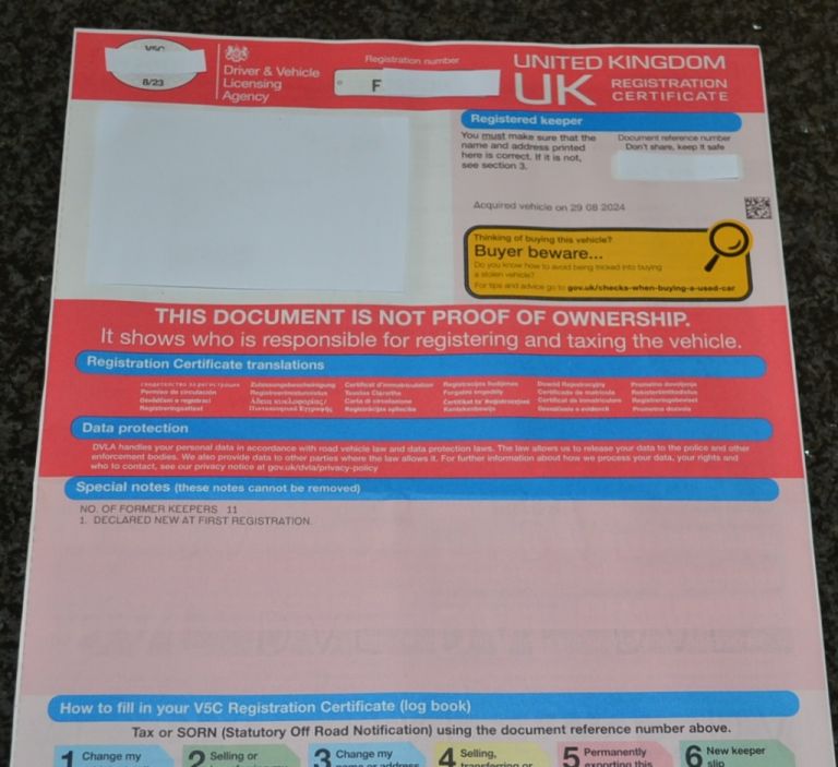 Registered in my name on the V5c, currently on SORN. The car has its original stamped VIN number clearly visible in the gutter beneath the scuttle and has its VIN plate attached to the OS inner wing.