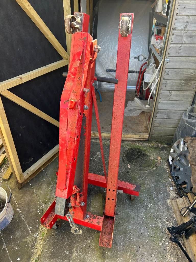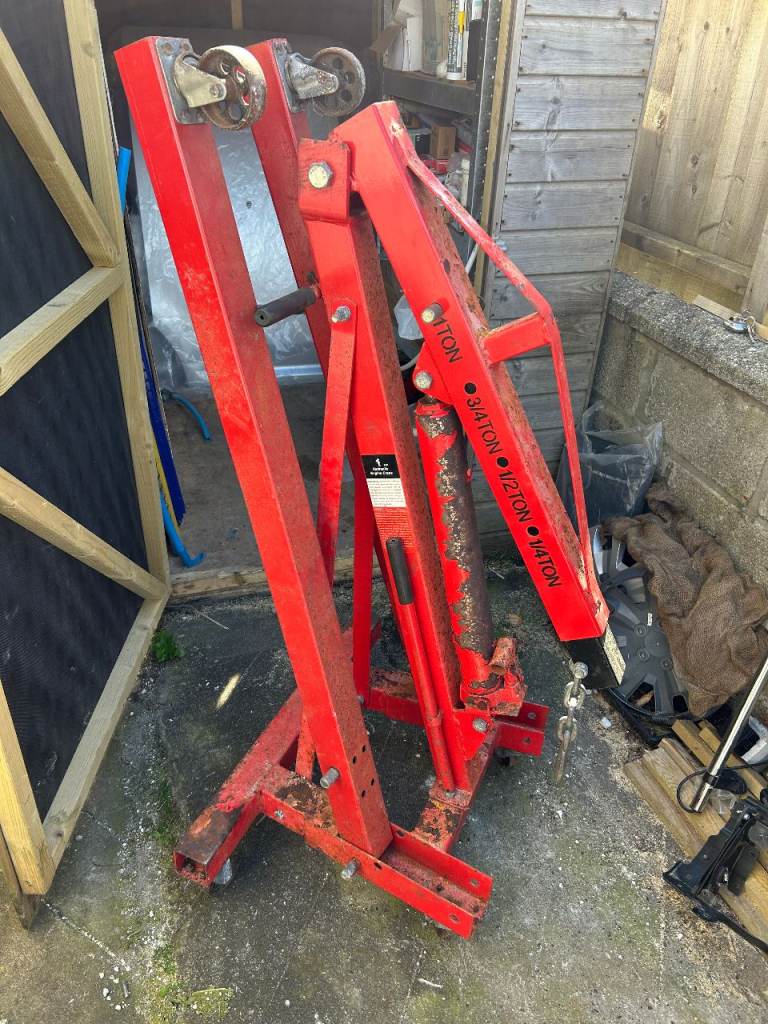 1 tonne engine crane. Used 3 times, stored in a garage. Hydraulic ram is sound and holds lift. Surface rust, usability not affected. Could do with a wire brush down and a rattle can.