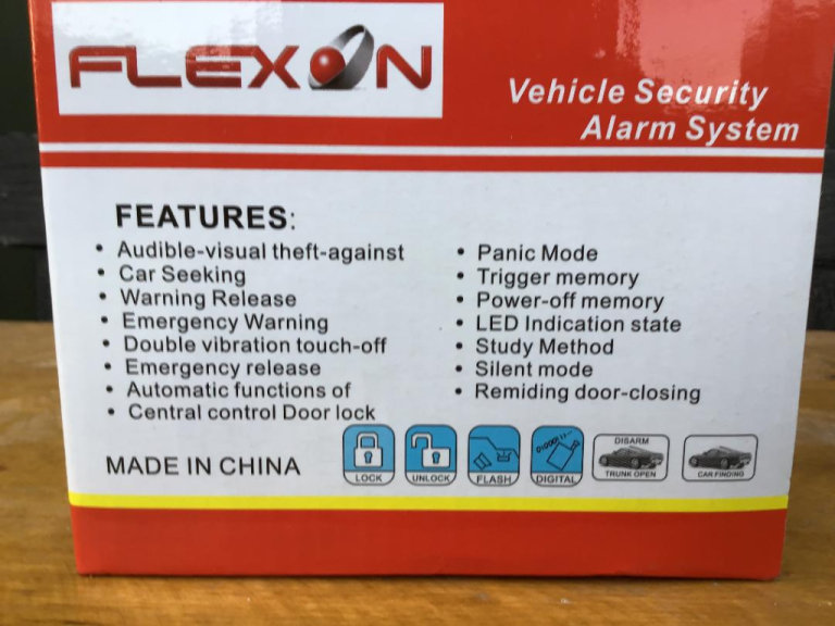 Flexon Car alarm system BM-02 as new in box, super remote selection alarm memory. Has many functions. All functions can been seen on the box.