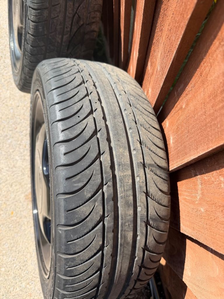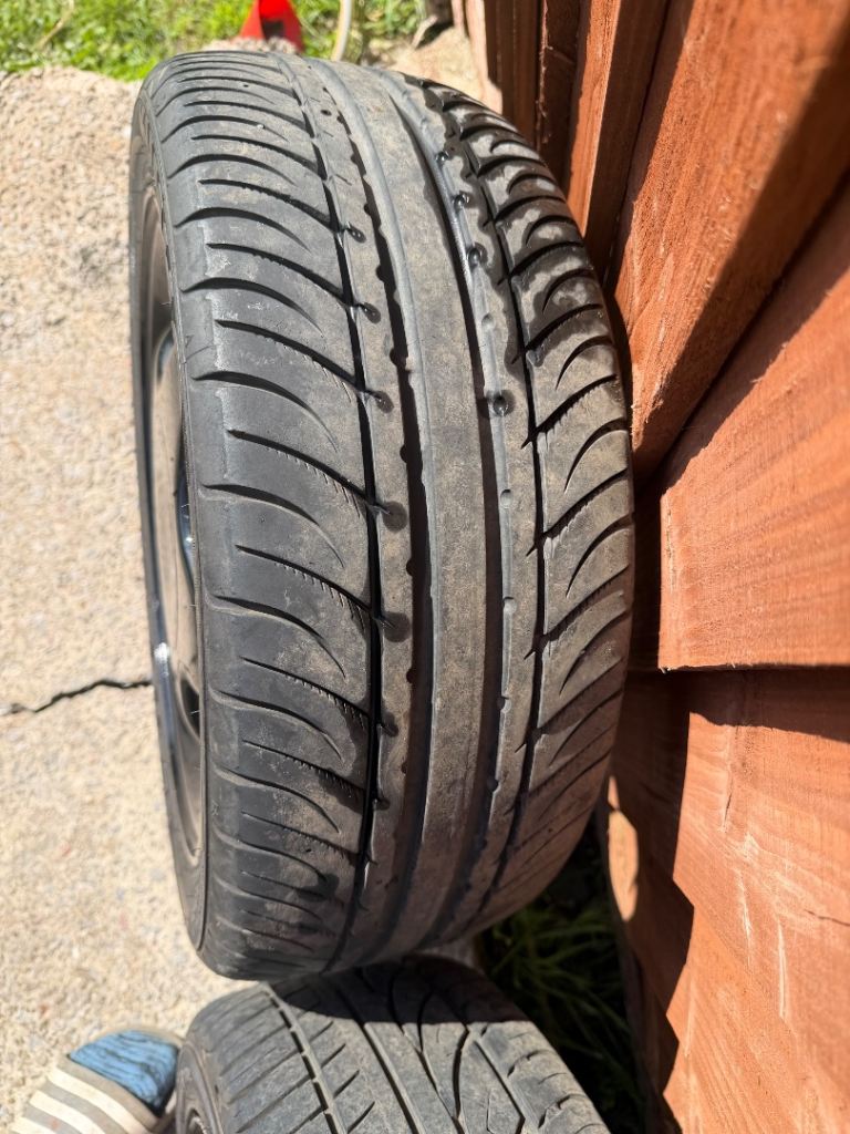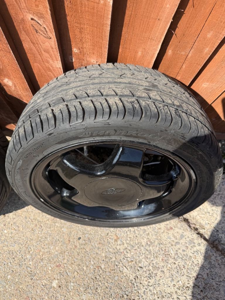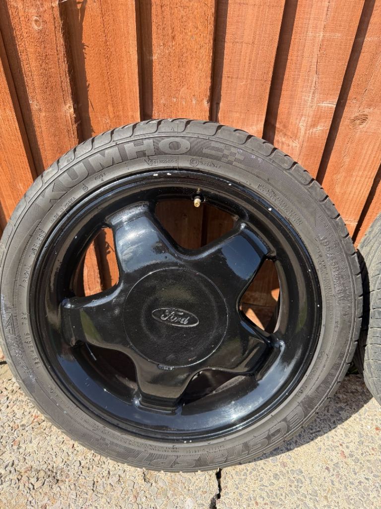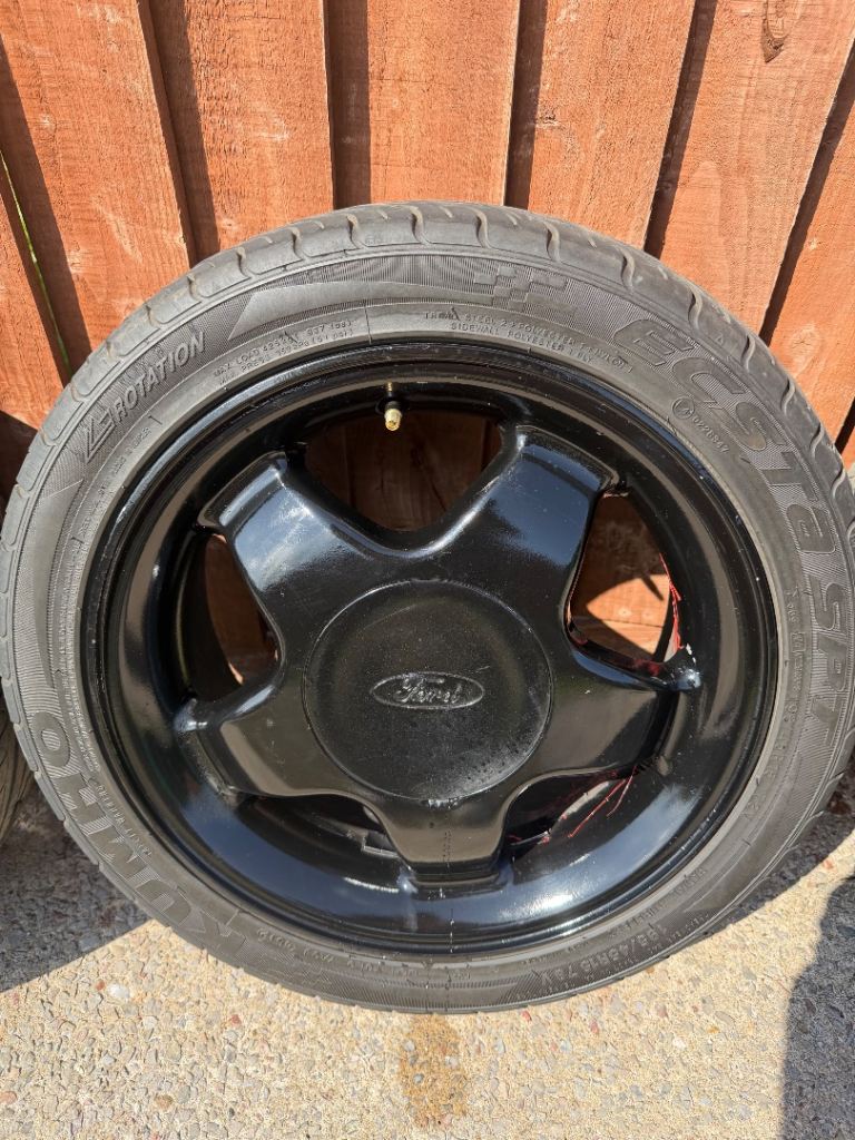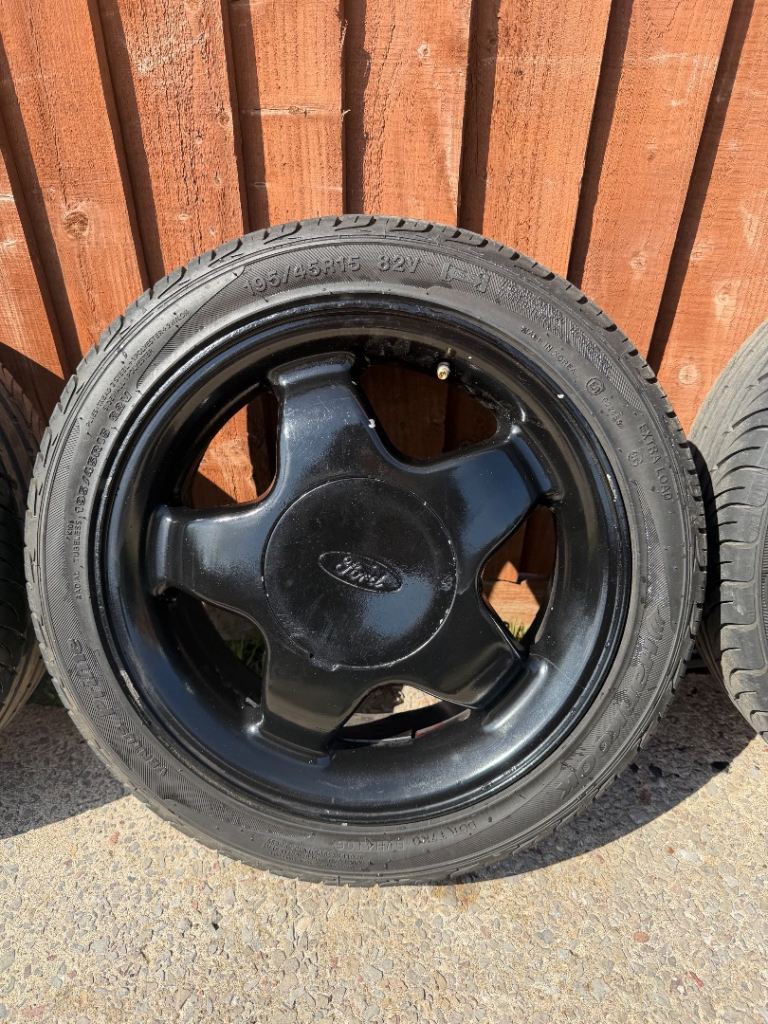 Here I have a set of Ford escort rs2000 alloys 15” in gloss black genuine Ford with centre caps Rare to find these with them on running 195 45 15” tyres all 4 tyres have grate tread no buckle straight Old Ford alloys £110 no offers