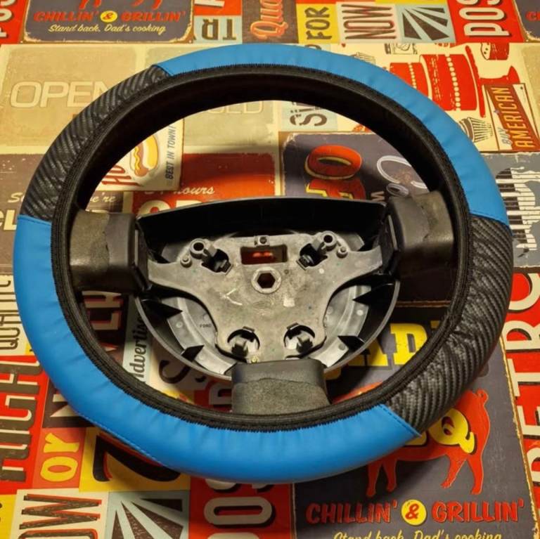 Steering wheel taken out of a Ford Fiesta MK6. Leather is well worn, but comes with a cover.