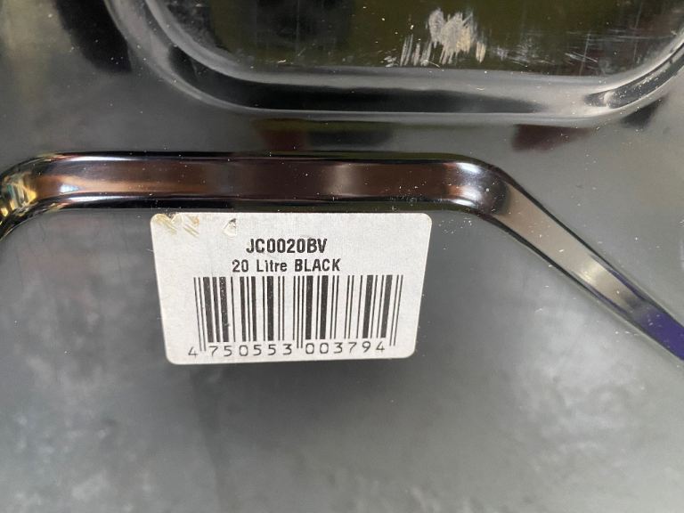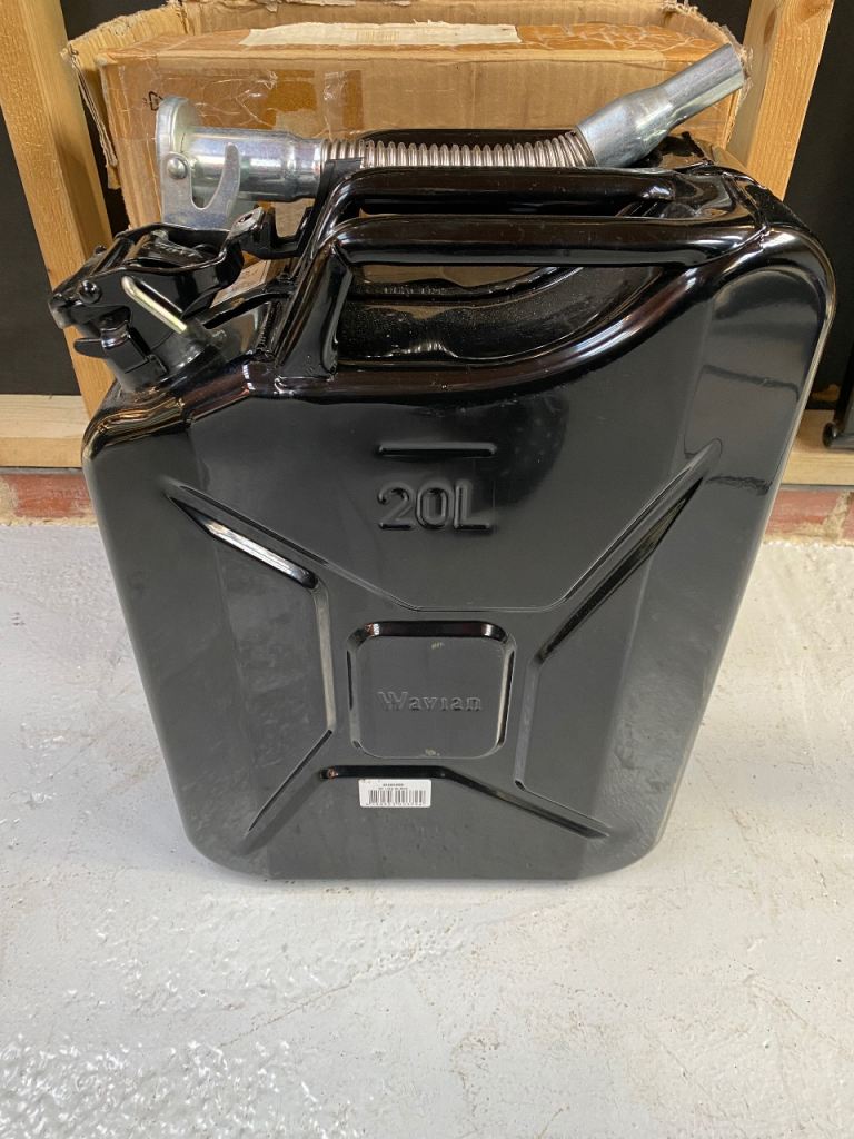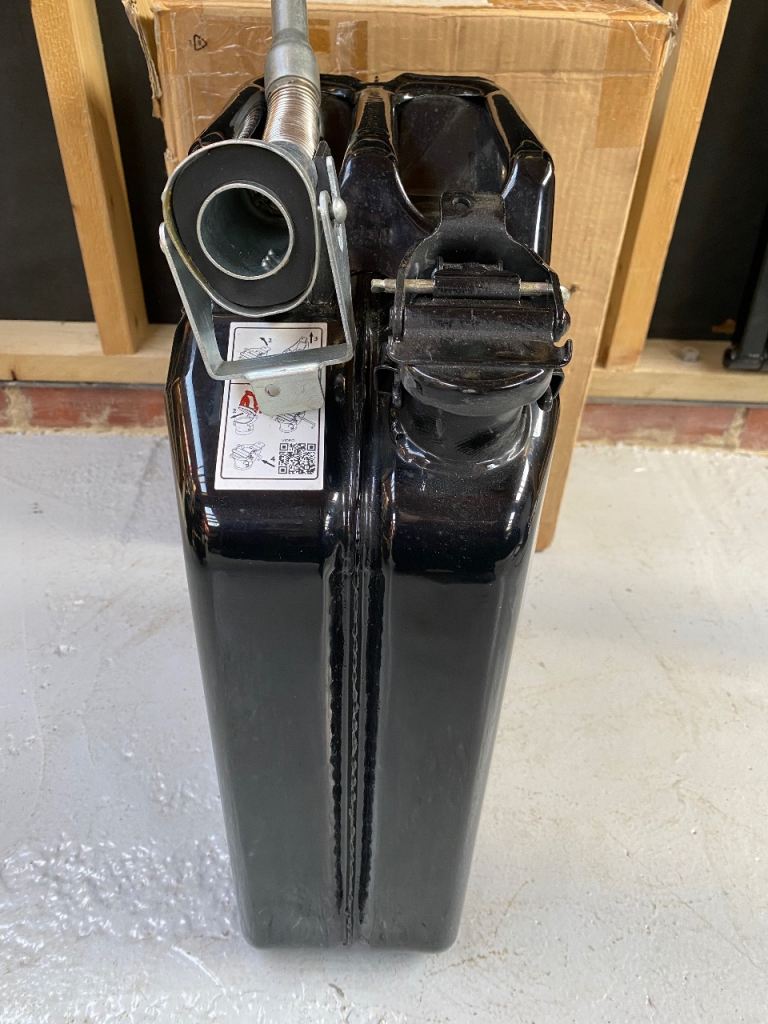 Black, metal, 20 litre fuel can.