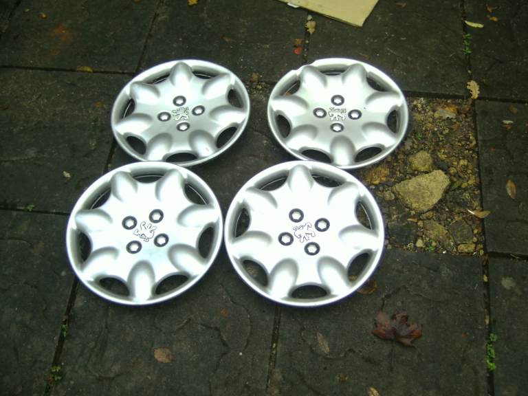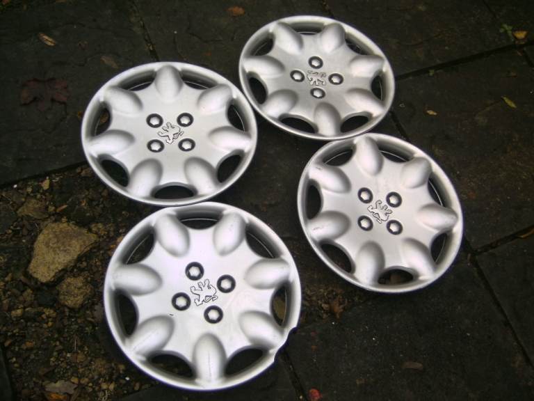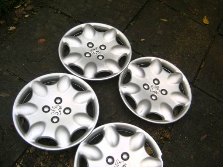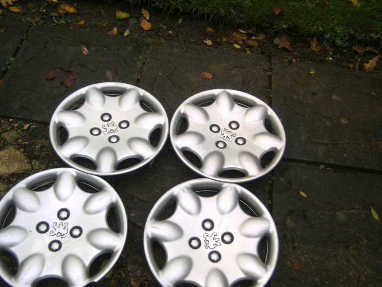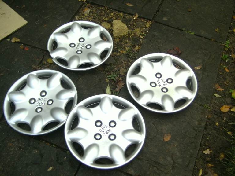 SET 4 , ORIGINAL PEUGEOT , FACTORY , 13 INCH WHEEL TRIMS , OFF PEUGEOT 205 , COMPLETE WITH RETAINING RINGS , FIT 13 INCH STEEL TRIMS , RARE RARE SET ORIGINAL TRIMS ,,,JUST £10 ,, CHURCHDOWN ,,,,,,,,, GLOUCESTER , GL3 1NS ,,,,,,,,,,