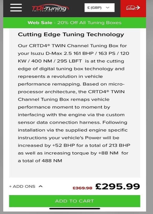 Isuzu D Max Mk2 2.5 TD Twin Turbo 2012-2017 Tuning Box +52Bhp/88Nm Parts Spares