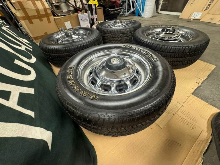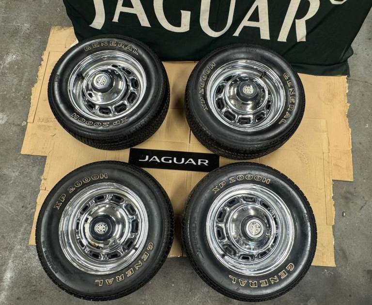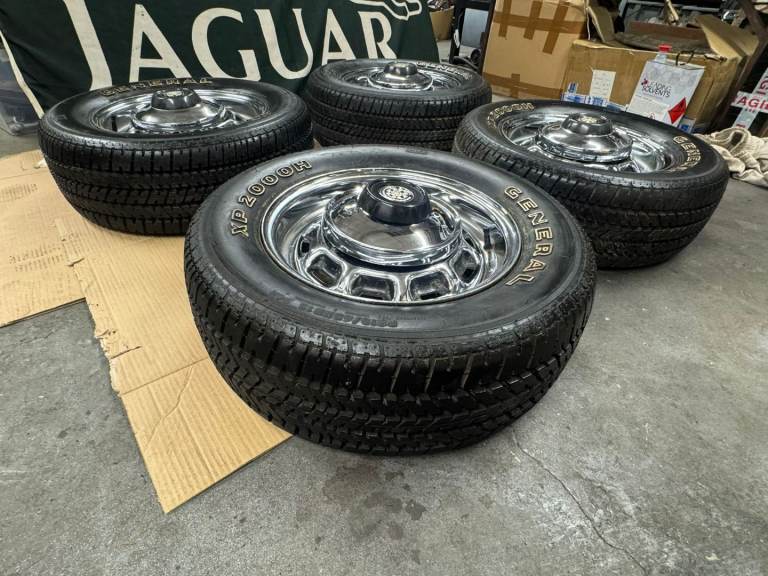 This is set of jaguar Daimler chrome steel wheels for a jaguar E.type XJ6 XJ12. XJ COUPE. Sparkling E.TYPE HUB CAPS BUT THE CENTRE IS REMOVEABLE. NICE PRESENTABLE CONDITION THE TYRES STILL HAVE THE LABELS ON collection or FREE UK VERIFIED COURIER DELIVERY