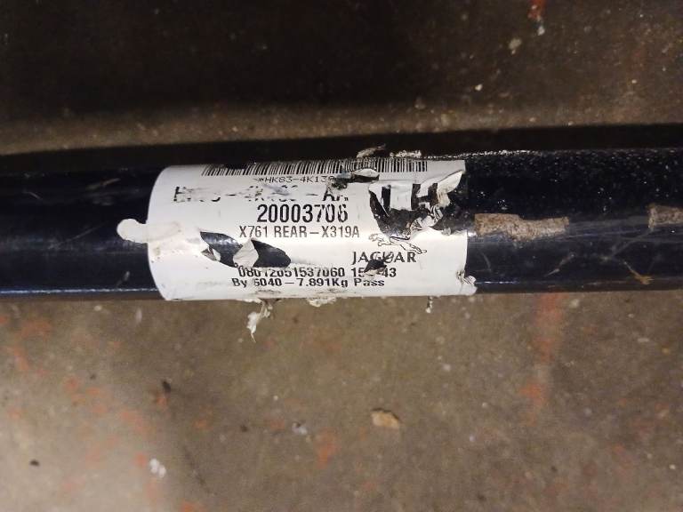 This is an original OEM Jaguar part removed from a vehicle. The driveshaft is in good used condition with normal signs of wear from use and storage.