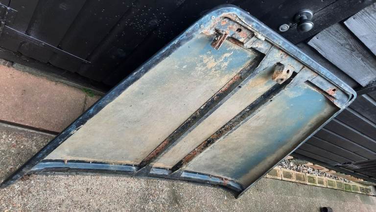 Land Rover Series bonnet in solid condition with no dents. Some surface rust on frame, requires striker pin.