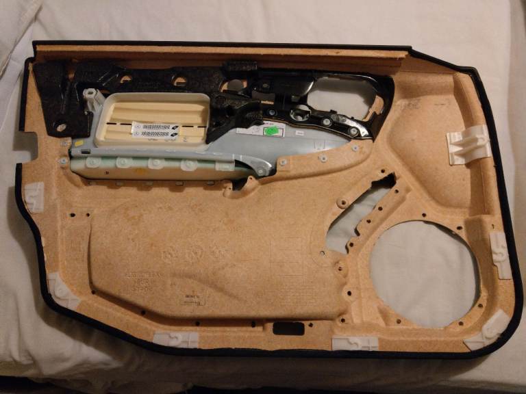 Repair that cigarette, burned saggy door card with this genuine part from Mercedes. Never used. To repair yours YOU will need to use all the fittings from your door card to restore your condition to "As New"