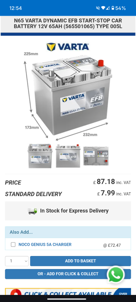 Posting for 9+ yearsN65 Varta Dynamic EFB Start-Stop Car Battery 12V 65Ah (565501065) Type 005L