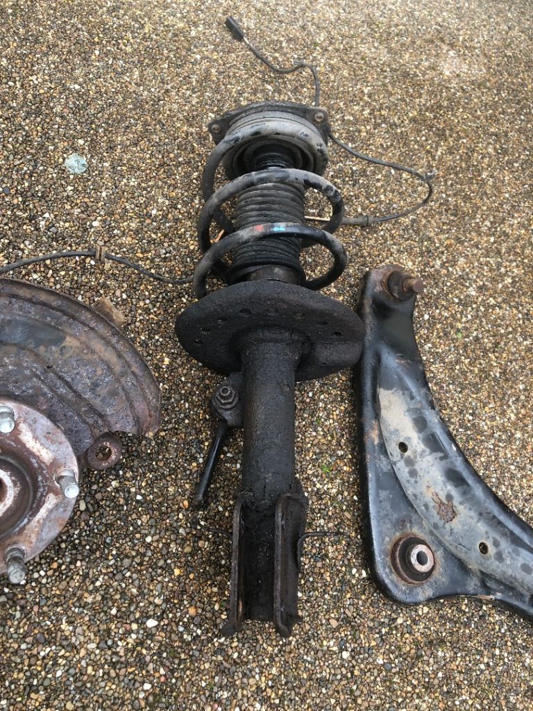 Nissan leaf o/s driver side suspension parts including shock absorber, spring, lower arm, abs sensor and hub. Price for all.