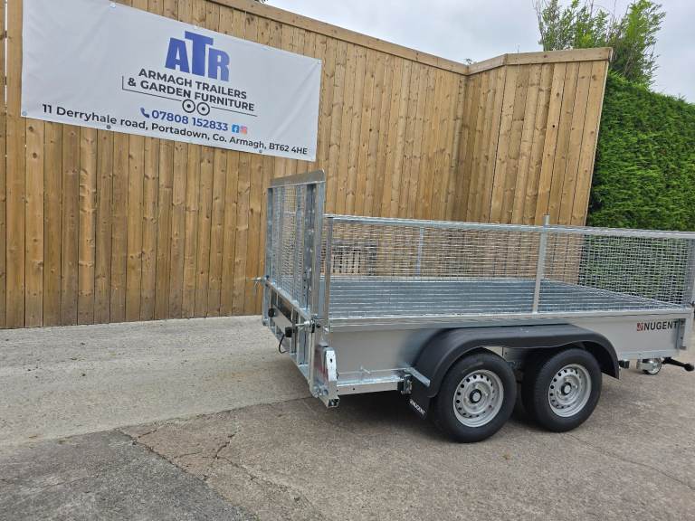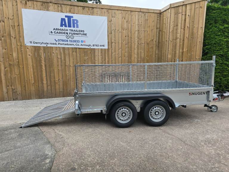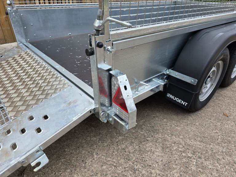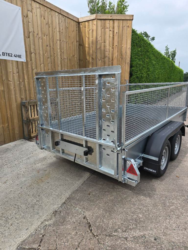 New nugent 10x5ft twin axle general purpose 2.7ton gross trailer with removable meshsides and ramp door, leds lights, bradley auto reverse 4 wheel braking, heavy duty ribbed jockey wheel and hitch lock.