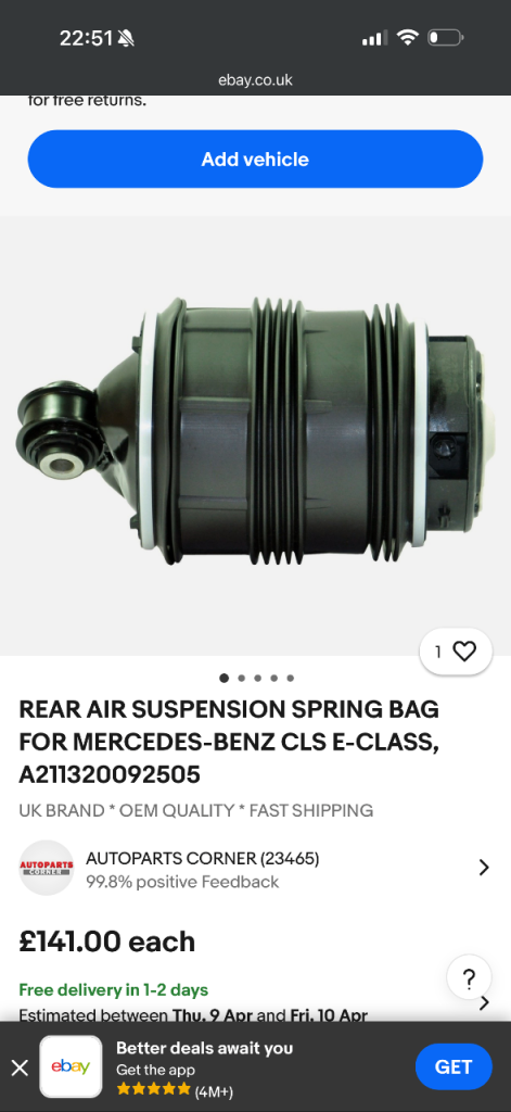Rear air suspension bag for mercedes benz cls- E class pair brand new