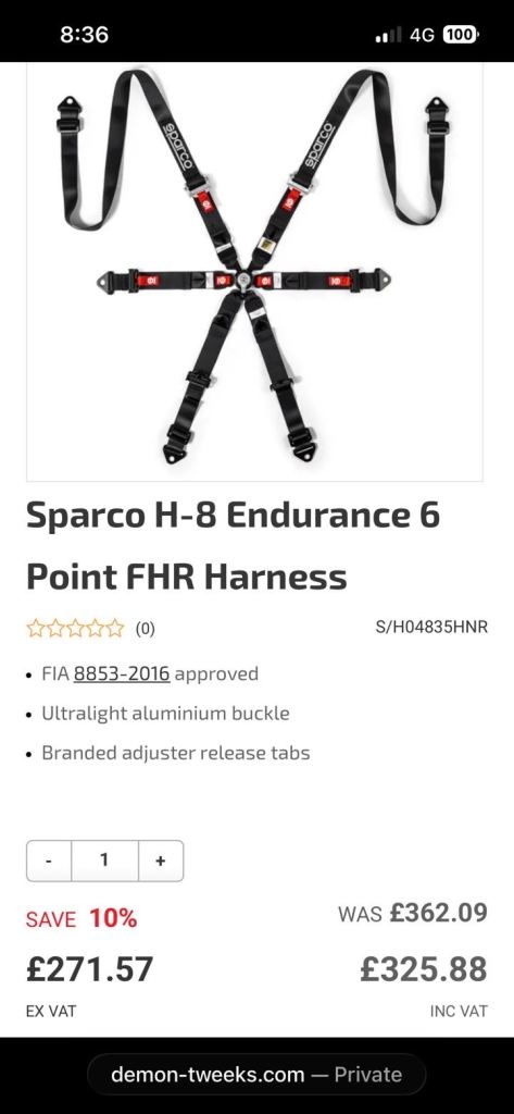 Sparco endurance 6 point FHR harness’s (pair) these cost me £650 all in from demon Tweeks.