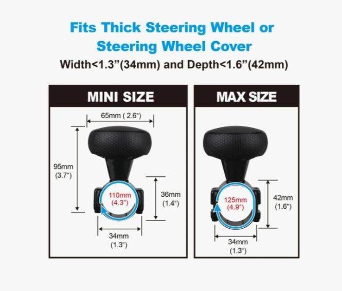 ✅【Large Knob】Black steering wheel knob with bigger mount than other knobs, it fits most vehicles; Fits steering wheel Diameter 1.3" - 1.6"; Please use the supplied rubber pad to protect the steering wheel and adjust the size. (Tip: the rubber pad can be cut and used)