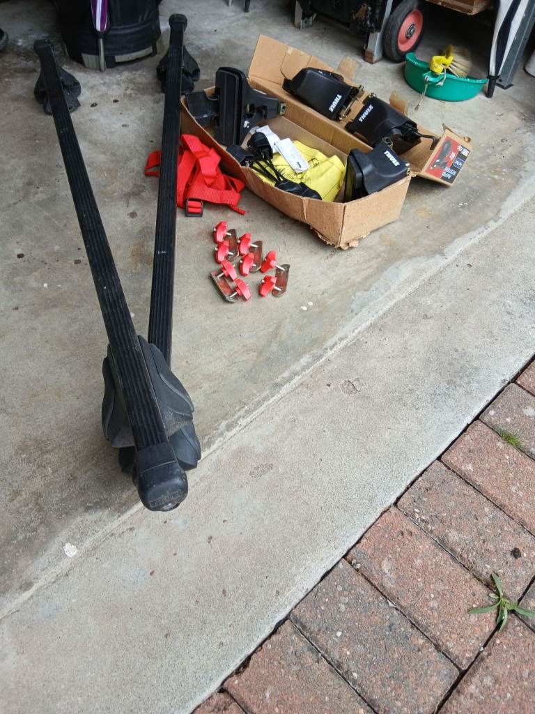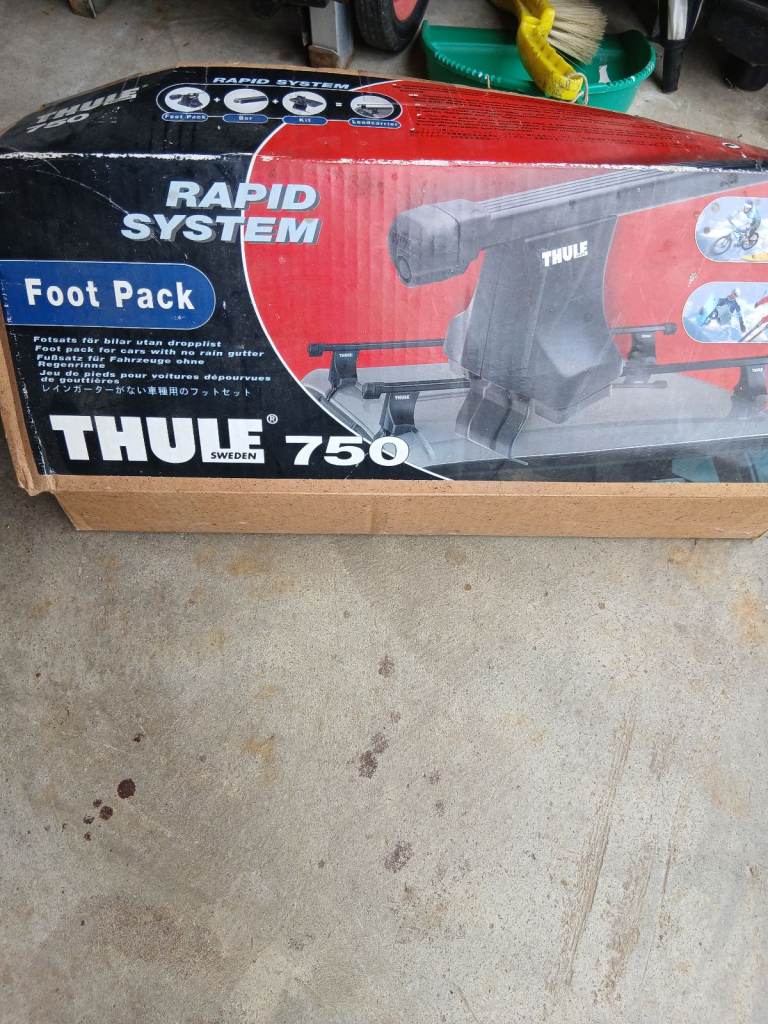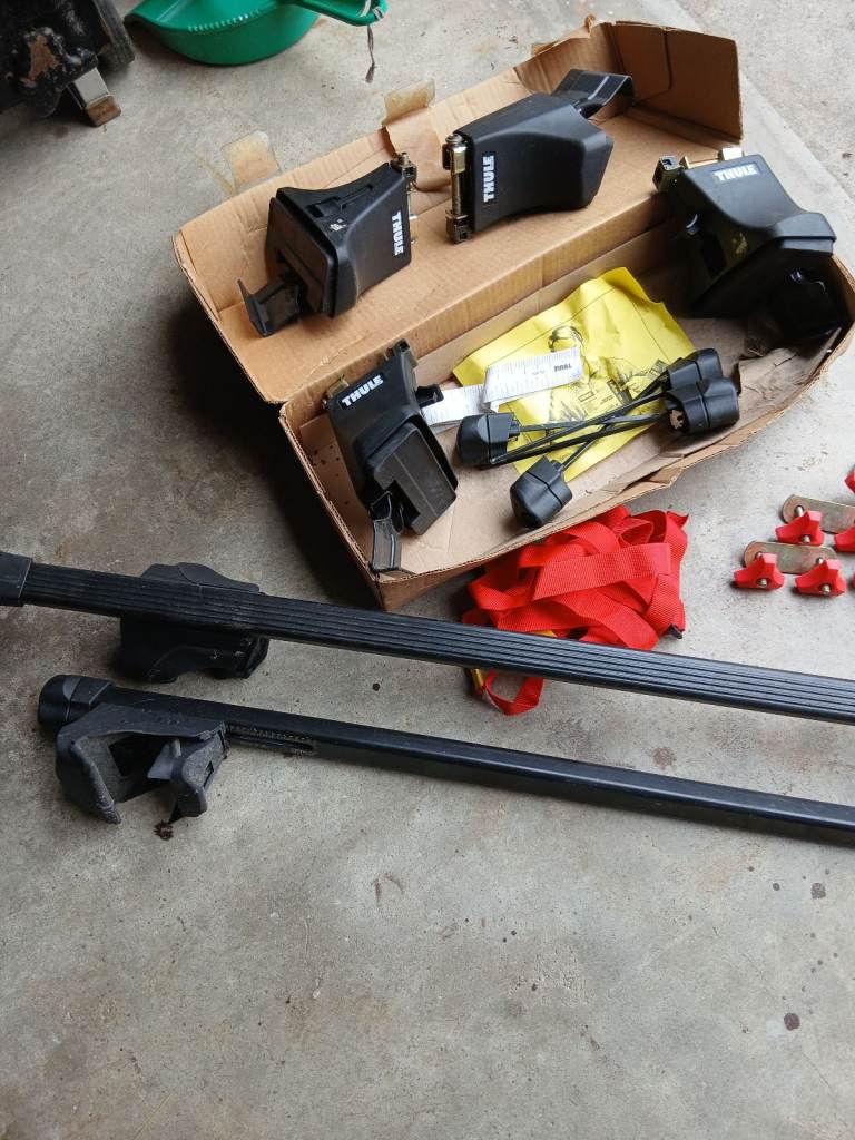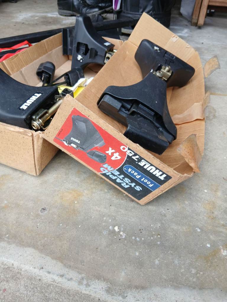 Full set of Thule 750 car roof box clamps and rails plus roof box fitting clamps. All in great condition and all parts with locking keys and torsion spindles.