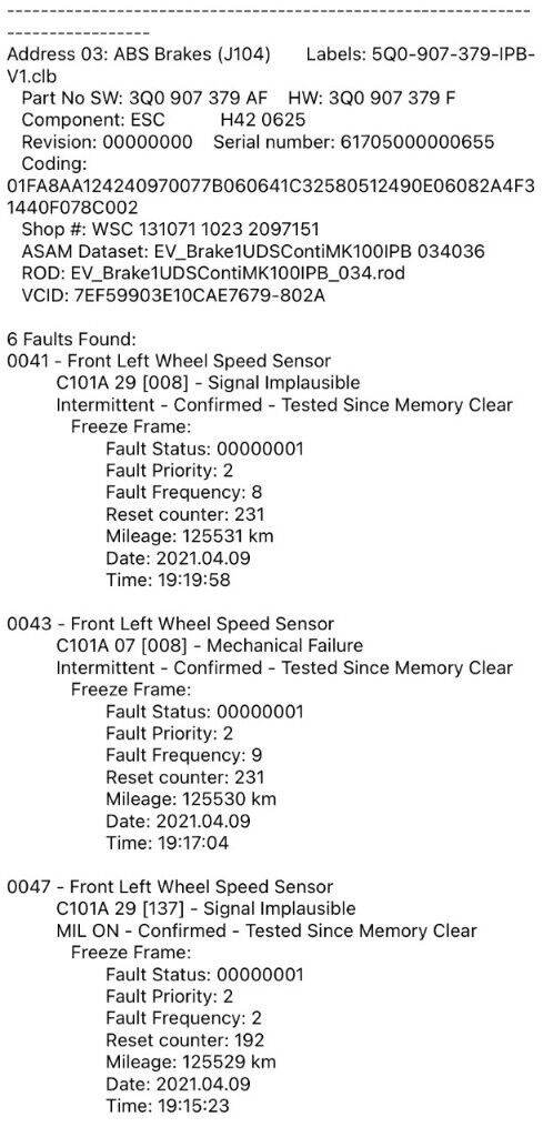Example : The faults identified in the last photo, allowed the owner to identify and replace the correct ABS wheel sensor, installing it himself for only £22 - saving him the trouble and expense of changing the incorrect sensor and it also cleared the malfunction light on the dashboard.