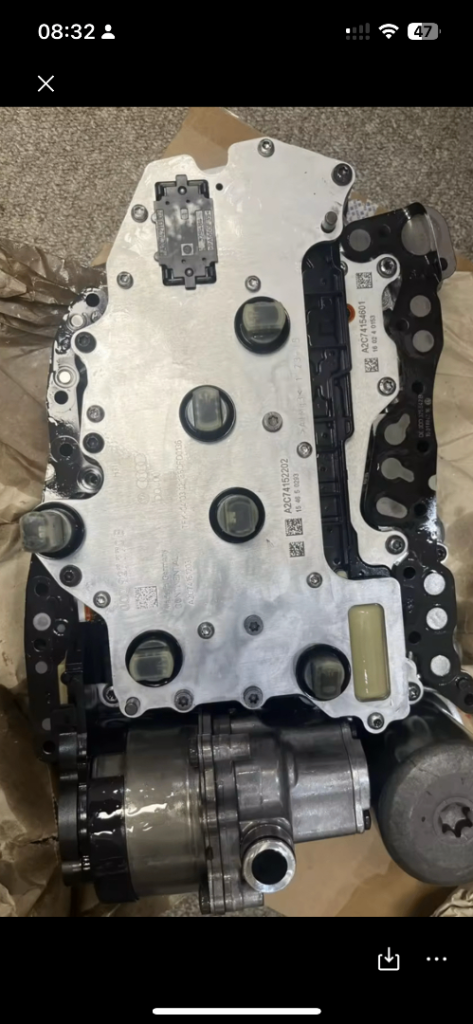 This is the original mechatronic unit from the car. It was replaced with a new unit. The mechanic diagnosed a low hydraulic pressure fault, so this unit may need repair or refurbishment.