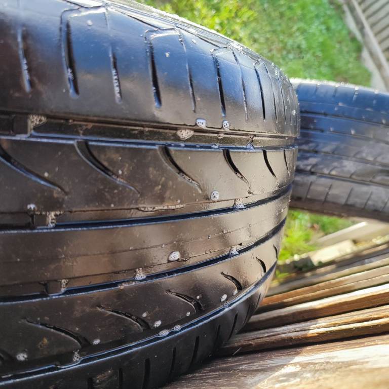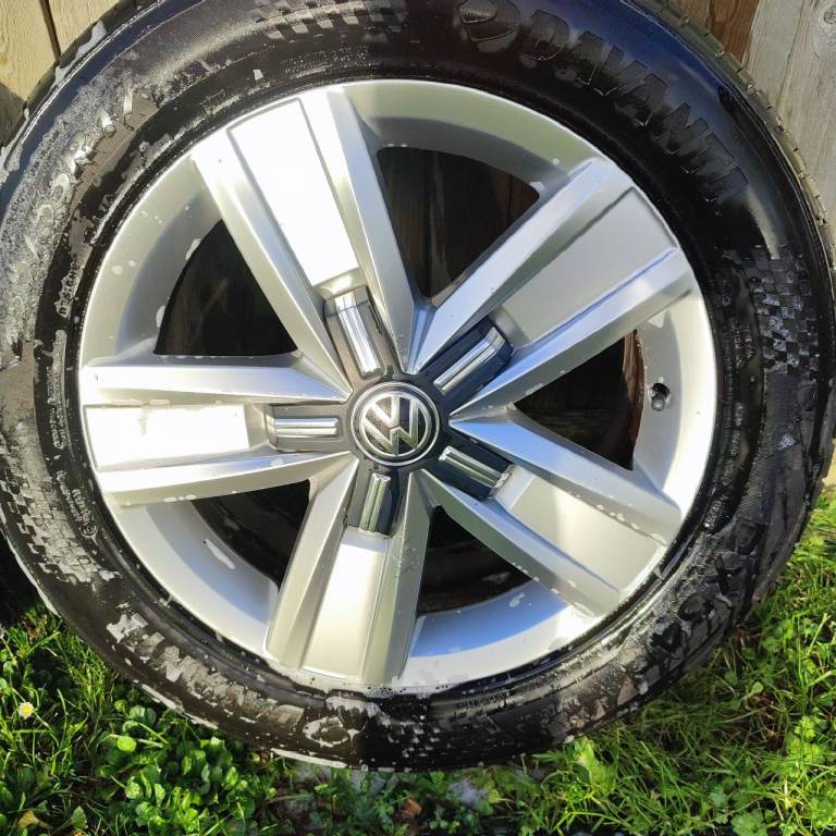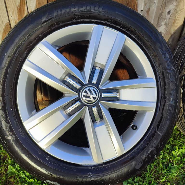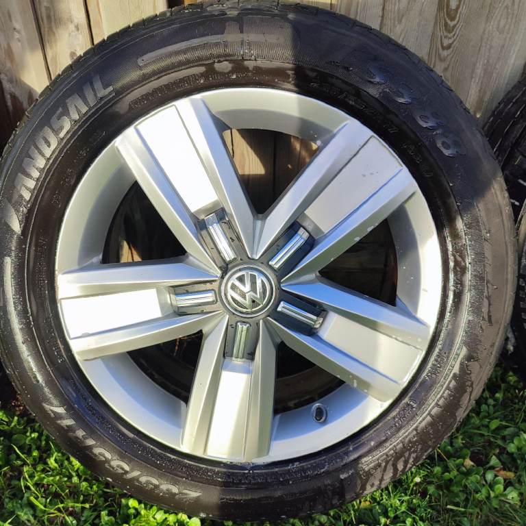 Set of 4 Volkswagen T6 Devonshire 17" alloys all in excellent condition including tyres. Rims are in good condition with no buckles. Each tyre is loaded rated for the van and are X2 at 5mm X1 at 6.4mm and X1 at 8mm as virtually new. Tyres sizes are 235x55x17 and 103w load rating. Tyres are Yokohama, Landsail and Devanti tyres.