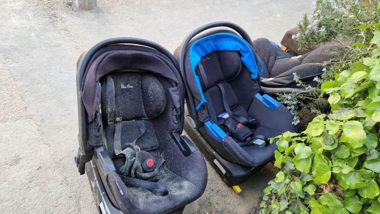 2x silver cross and 1x maxi Cosi car seat with ISOFIX bases.