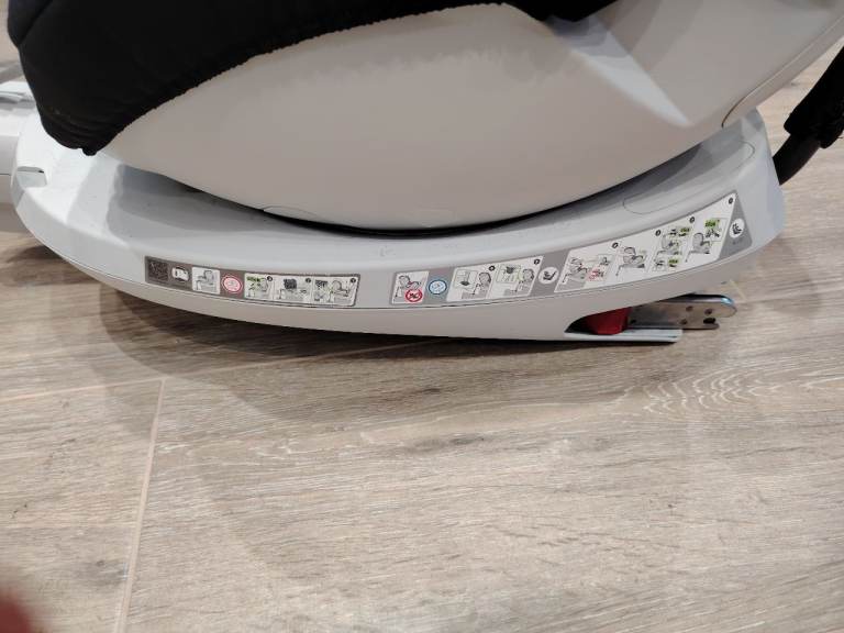 At the press of a button can be turned towards the open car door, making it easy to place your child in the seat and fasten the harness