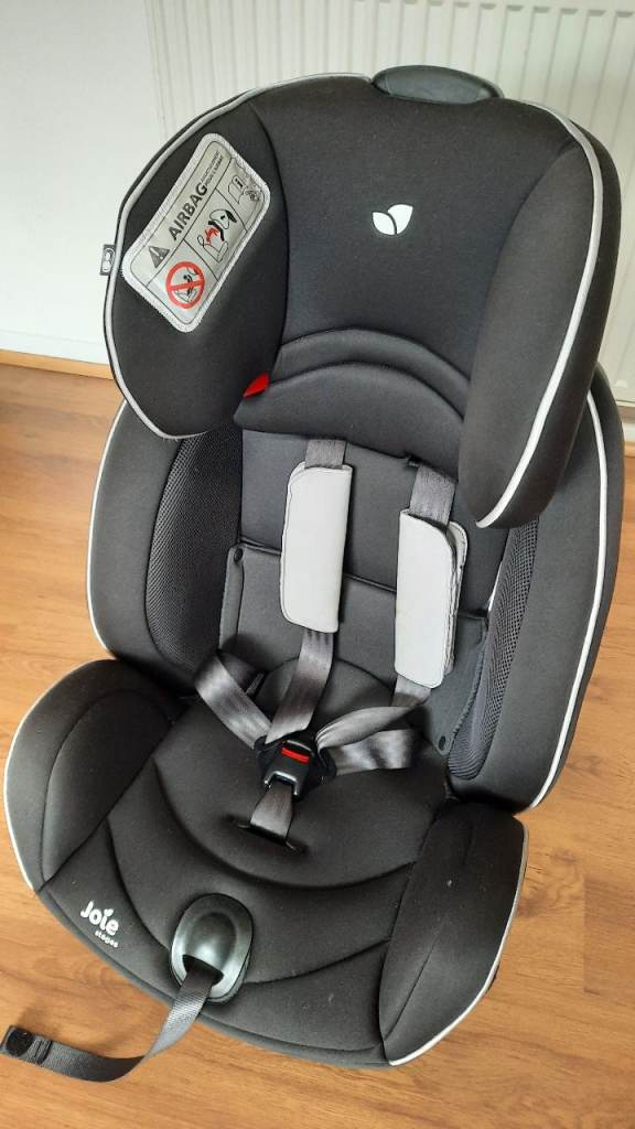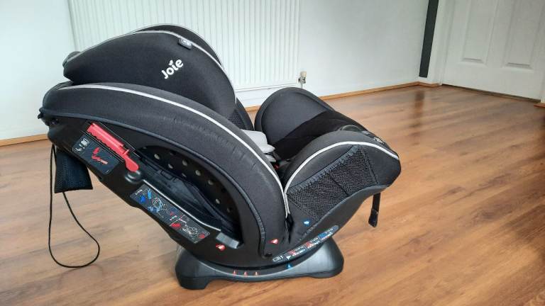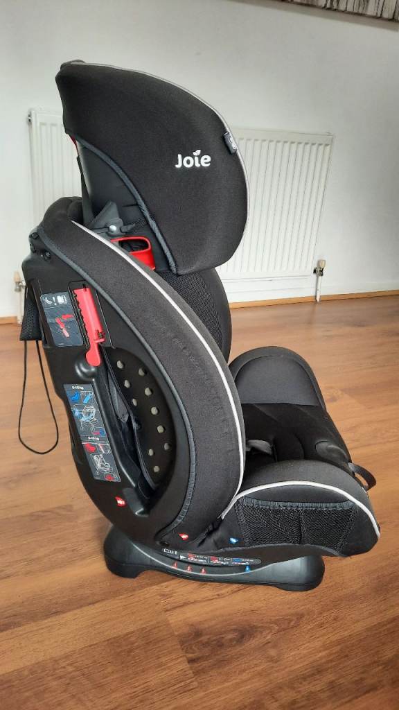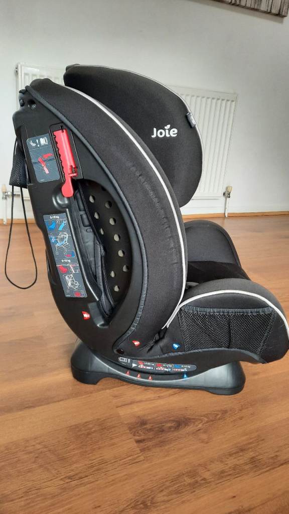 Joie stages car seat. Positions for 0-18kg, 9-18kg, and 15-25kg. Rear facing and forward facing positions. Three reclining positions. Adjustable headrest.