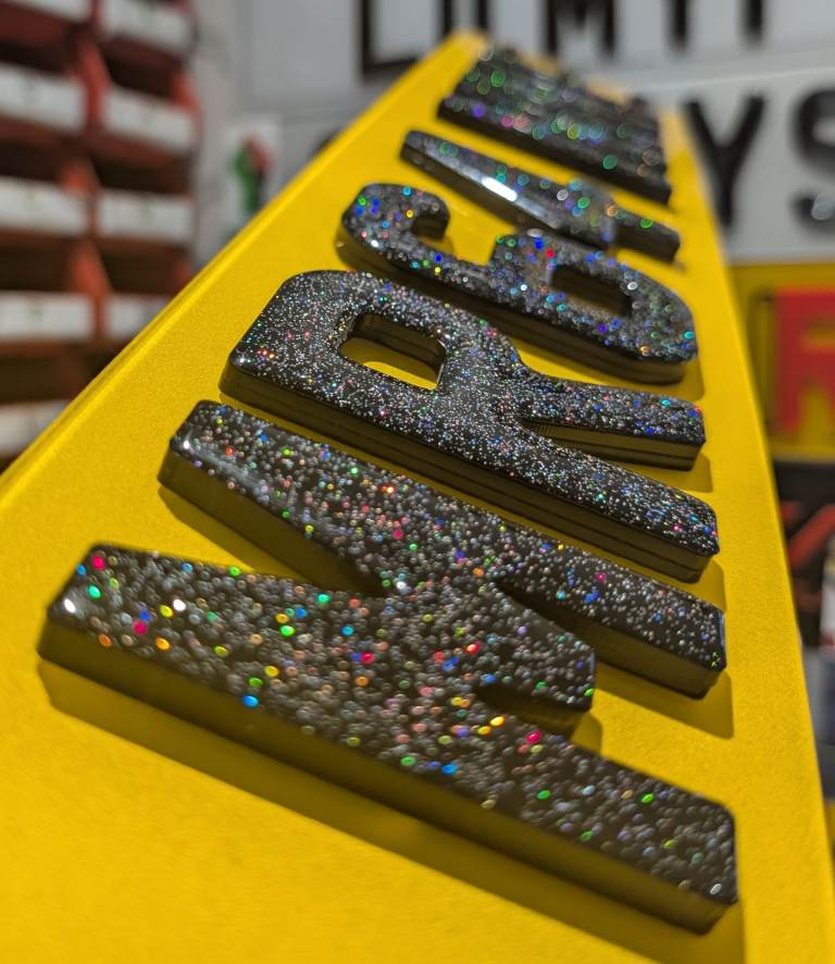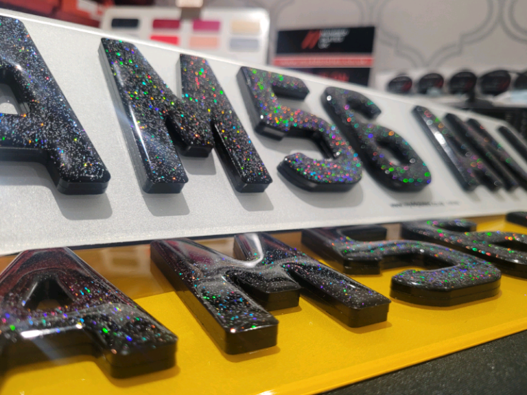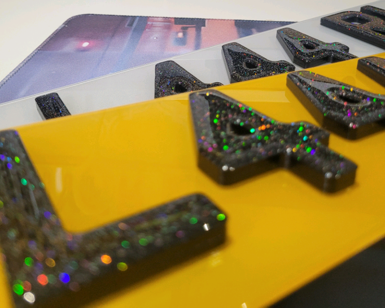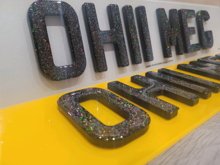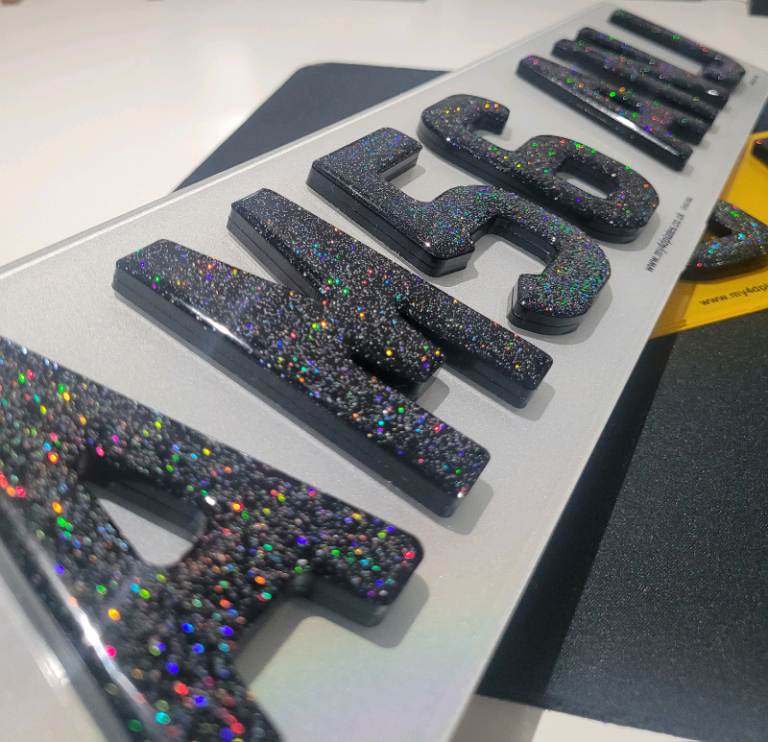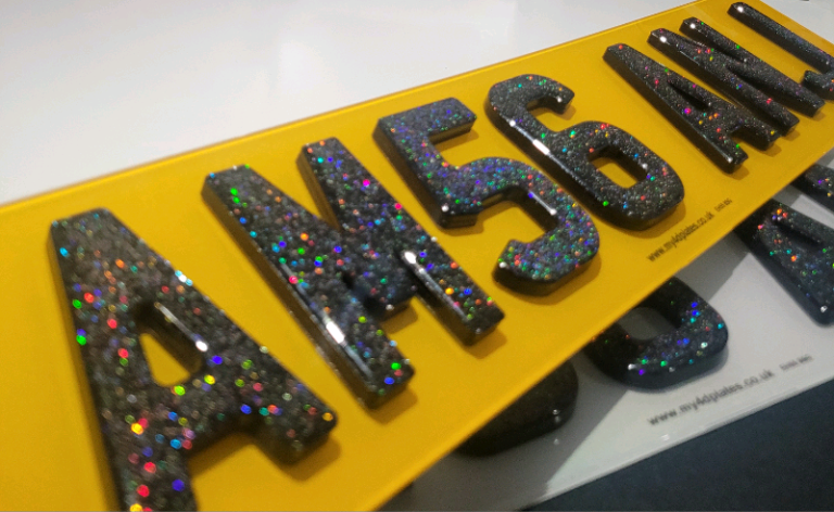 6mm Glitter 4D Gel car number plates available in black 4d or neon blue or red 4d. Available in Standard size plate, 6 digit short plate (399mm x 111mm), 5 digit plates (330mm x 111mm) or hex 6 and 7 digit plates. Also available in tinted plates and blank plates without company name and BS stamp. Road Use or Show Plates.