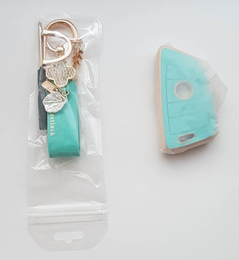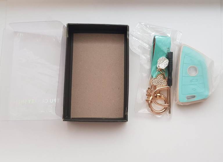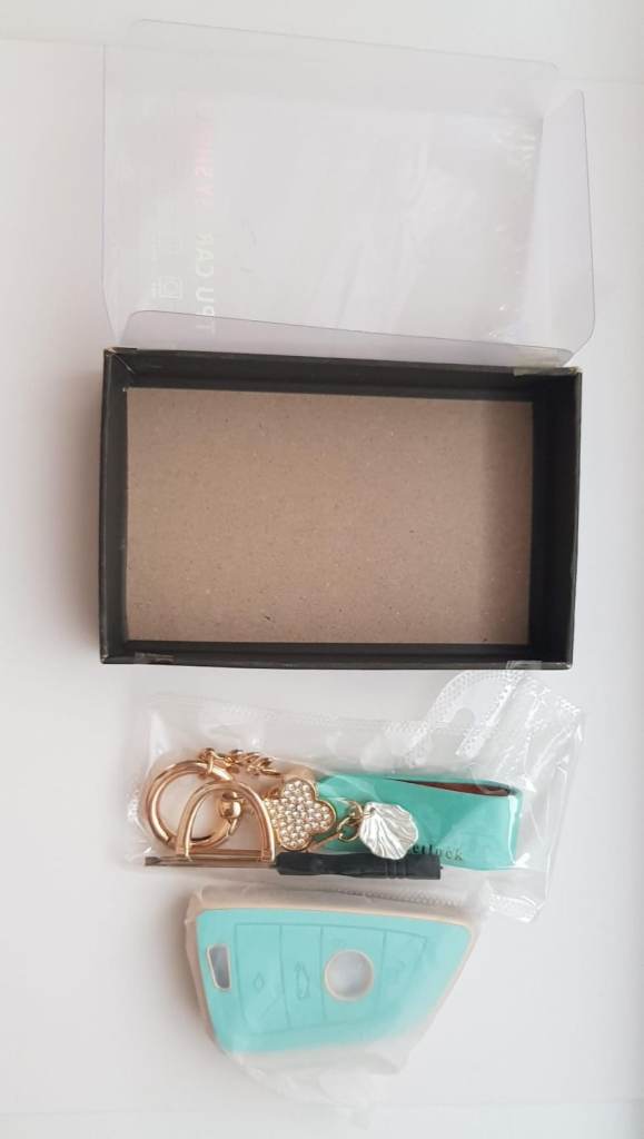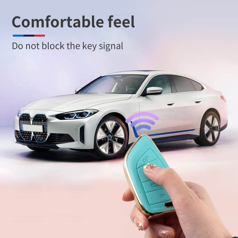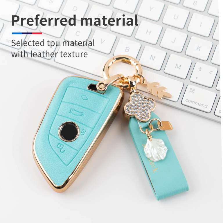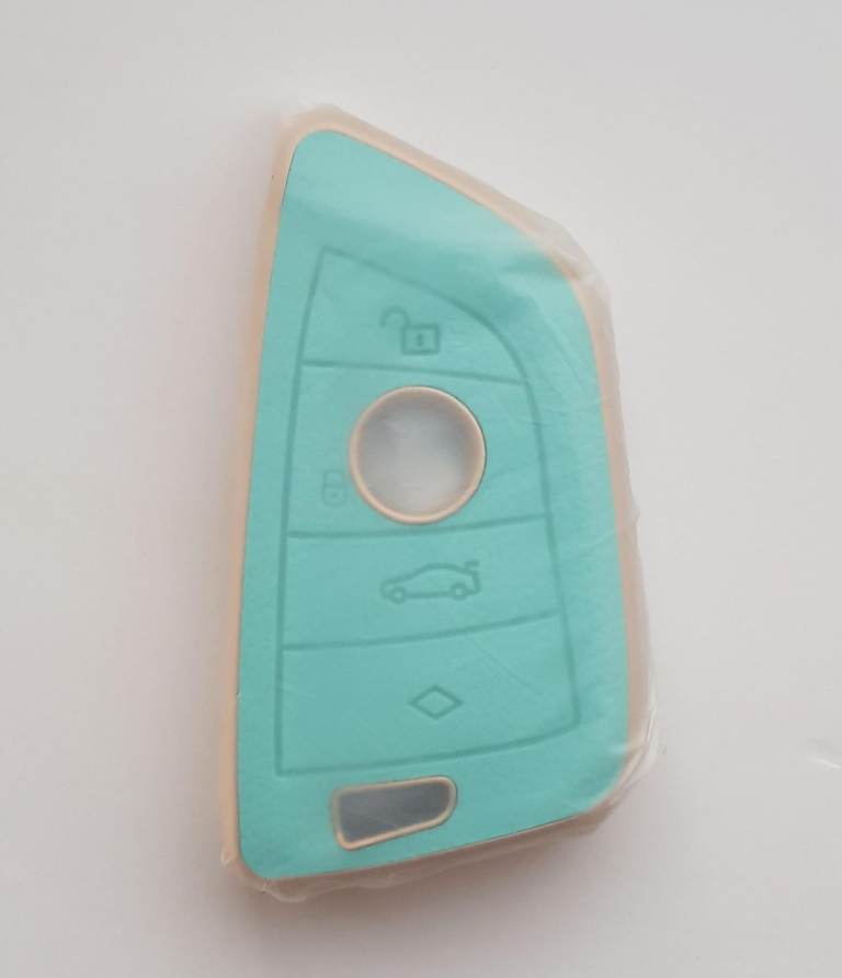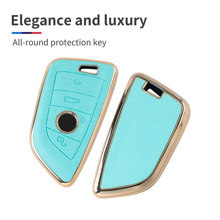 Brand new TPU & leather key fob cover for BMW blade‑style smart keys. Light blue with gold trim. Protects your key from scratches and everyday wear while giving it a clean, stylish look.