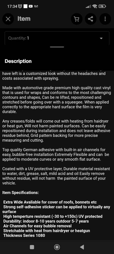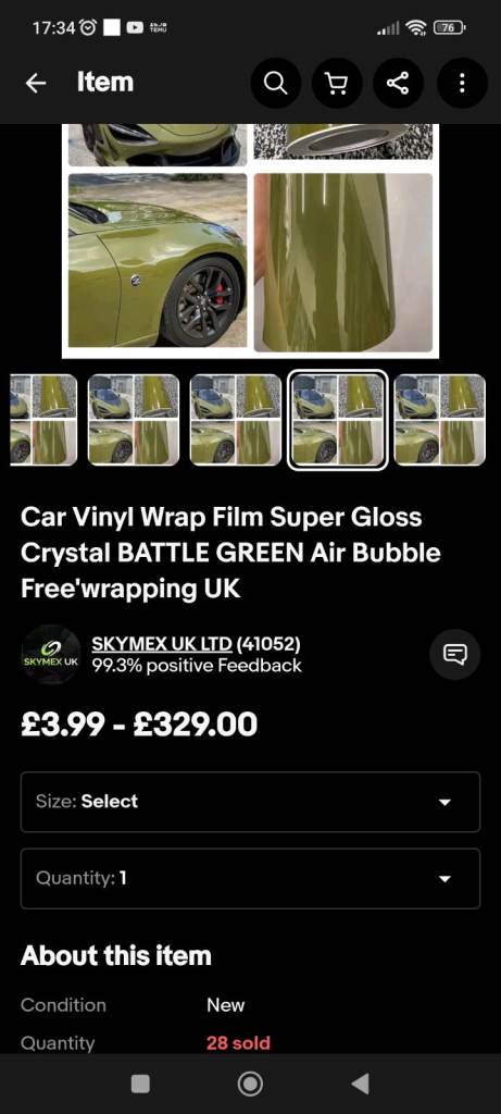 All the details of this product are in the photos, I bought this to wrap my car, I've sold the car and no longer need it, bought for £329, will sell for £280