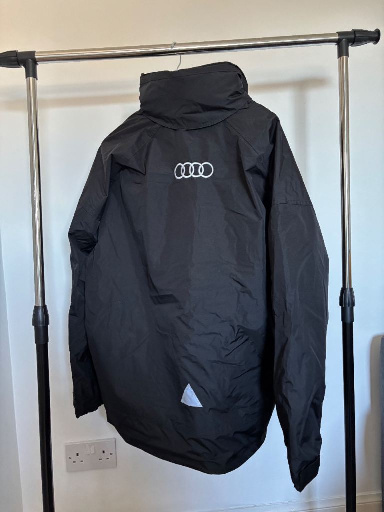 I have for sale an original Audi jacket with a removable lining. It’s brand new, never worn, and waterproof. Size L reason for sale —just a bit too big for me. It also comes with a hood and is of amazing quality.