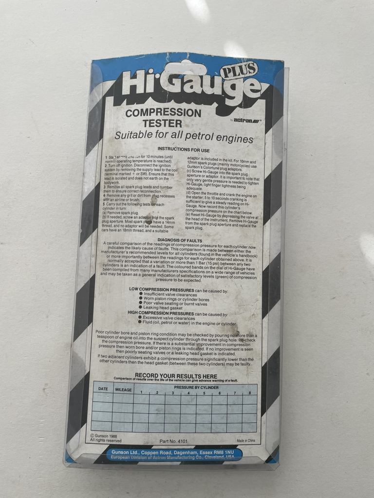 Gunson’s Hi Guage compression tester. New and unused. Retail for £85. Yours for £45.. perfect addition for the diy enthusiast or professional.