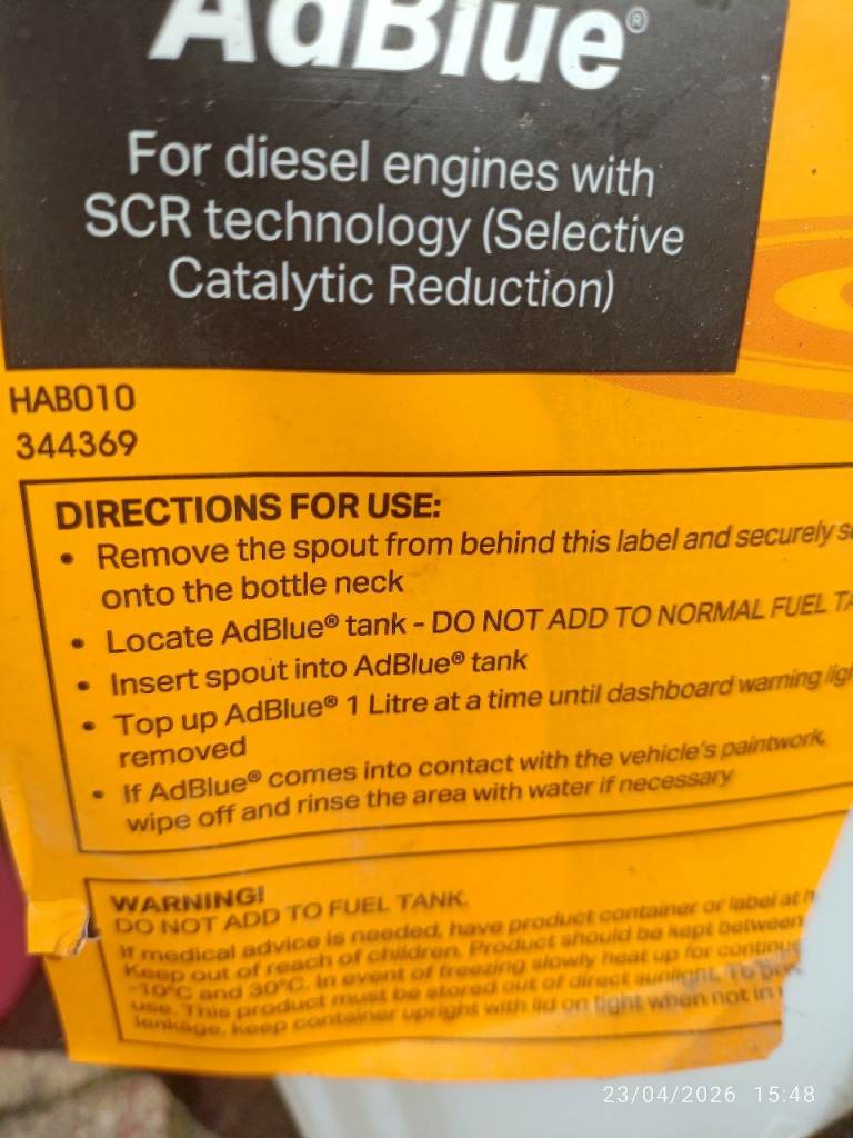 Large Canister of AdBlue, now not needed as we have an EV. Comes with funnel to apply.