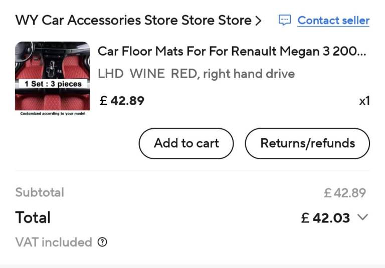 Floor mats for a Megane 3 2008 to 2015. I purchased the mats of AliExpress a while ago but have since purchased a new car. The first image is the closest I could find to what I purchased and the second image is my actual order. The listing has since been removed so I cannot open it up. Mats are brand new and still in the delivery package. Paid £42 for them.