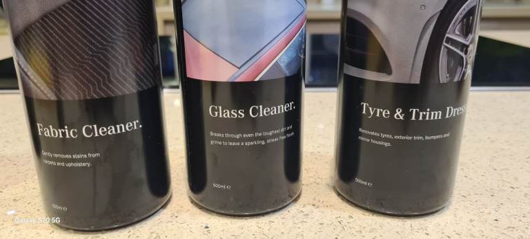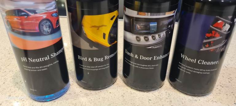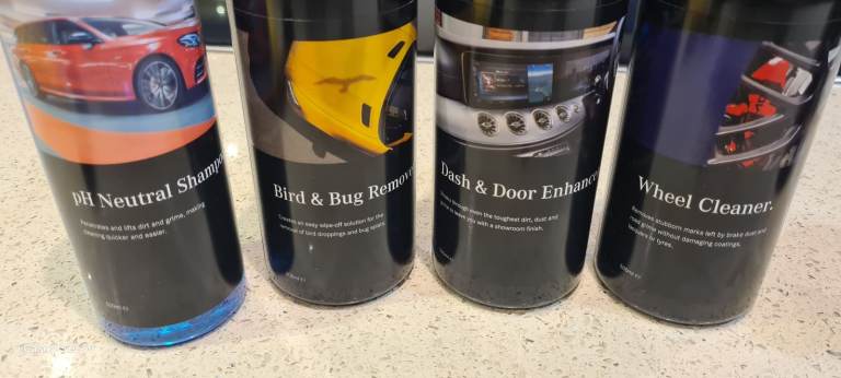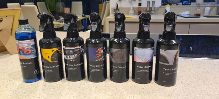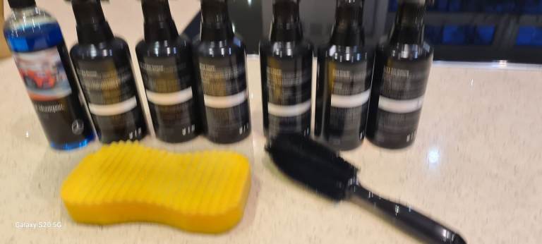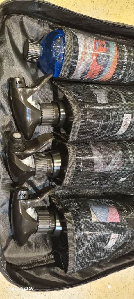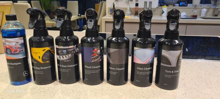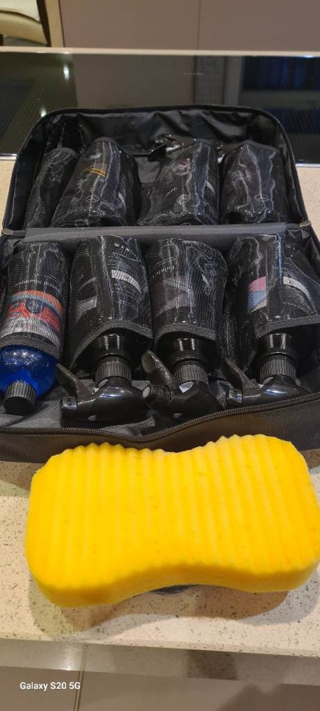 includes ph natural shampoo, tyre and trim cleaner, fabric cleaner, Glass cleaner, bird and bug remover, dash and door enhancer, wheel cleaner, spong, brush , carry case.