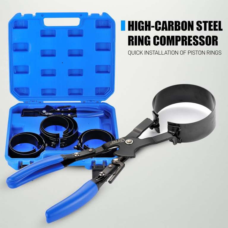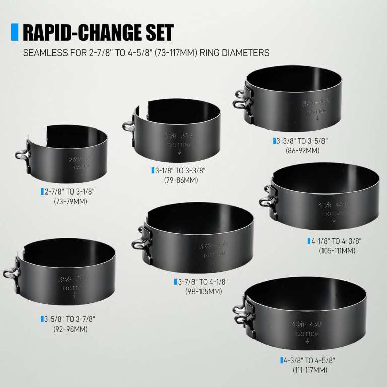 PACKAGE CONTENTS: This piston ring compression tool kit includes 1 Ratcheting Compression Plier and 7 different sizes of compression bands. Bands sizes include: 2-7/8” to 3-1/8” (73-79 mm), 3-1/8” to 3-3/8” (79-86 mm), 3-3/8” to 3-5/8” (86-92 mm), 3-5/8” to 3-7/8” (92-98 mm), 3-7/8” to 4-1/8” (98-105 mm), 4-1/8” to 4-3/8” (105-111 mm)
