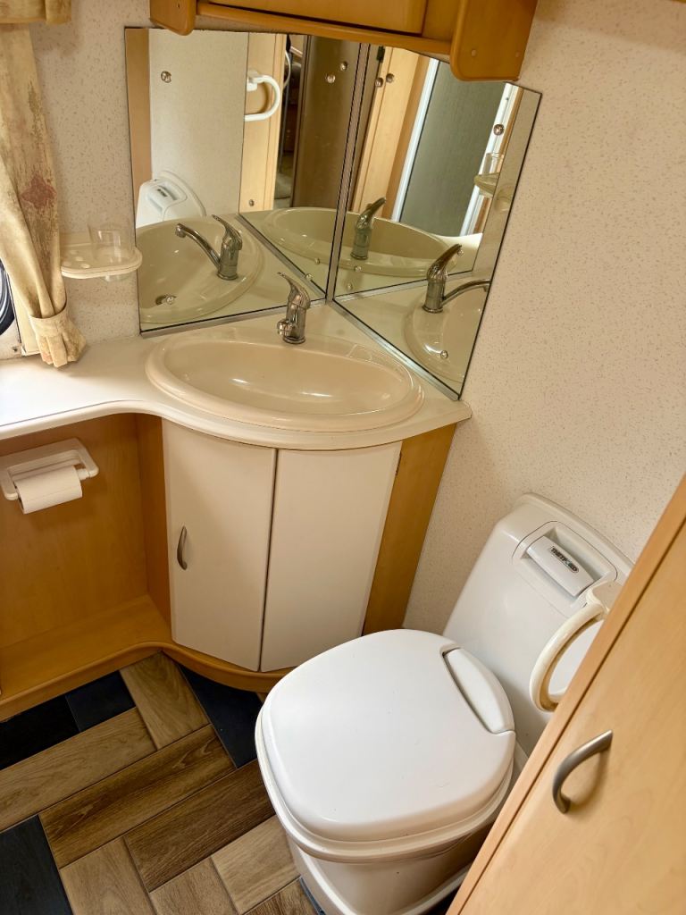 All modern amenities such as blown air heating, 3-way fridge, recessed sink with mixer tap, domestic style gas oven/grill/hob. Large rear washroom with other Ford cassette toilet, vanity sink and large walk in shower cubicle.