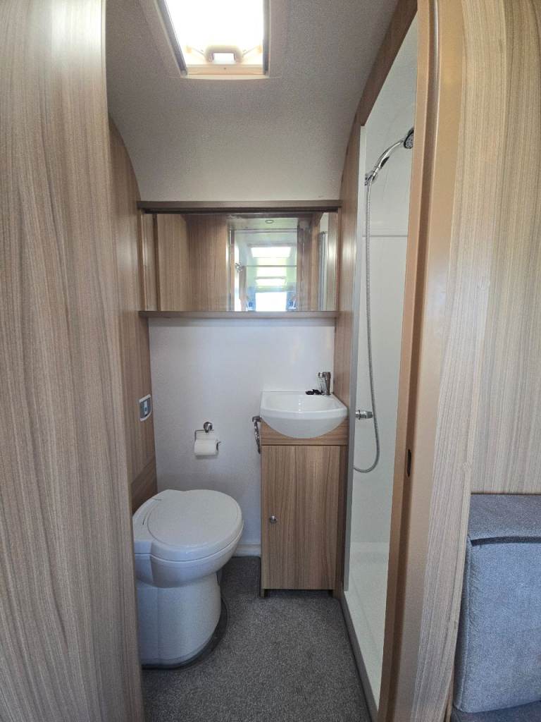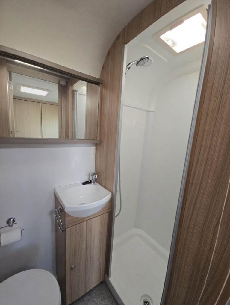 Generous end washroom with separate shower, cassette toilet & plenty of storage