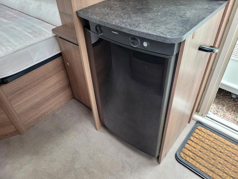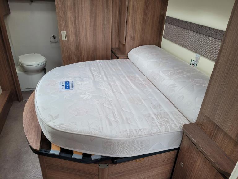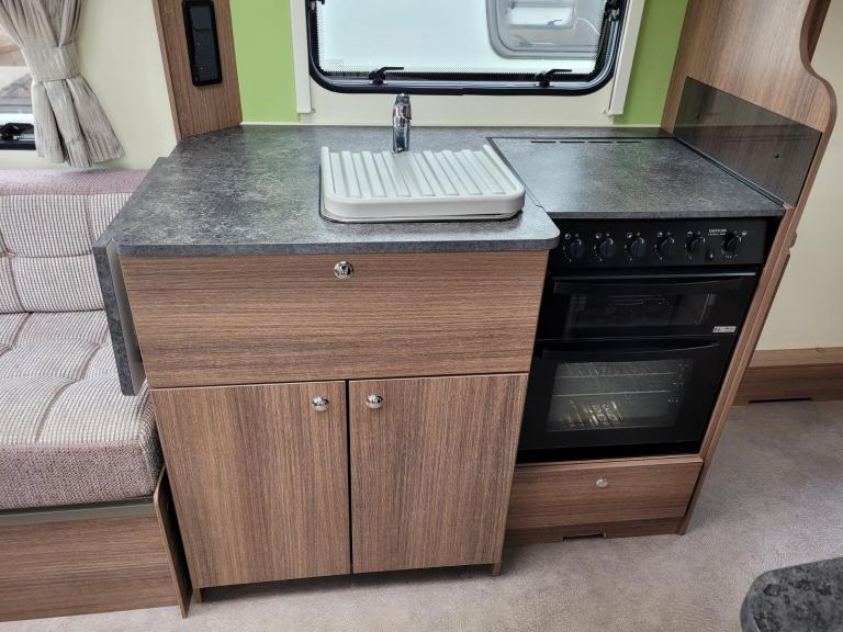 Spacious single axle four berth caravan with the popular transverse fixed island bed layout. Bench seating converting to an additional double bed at the front, centre kitchen area with fridge, full cooker and integrated microwave, whilst the end bathroom has a cassette toilet, separate shower cubicle and vanity hand basin unit. This caravan further benefits from a motor mover already fitted for ease of manoeuvring .