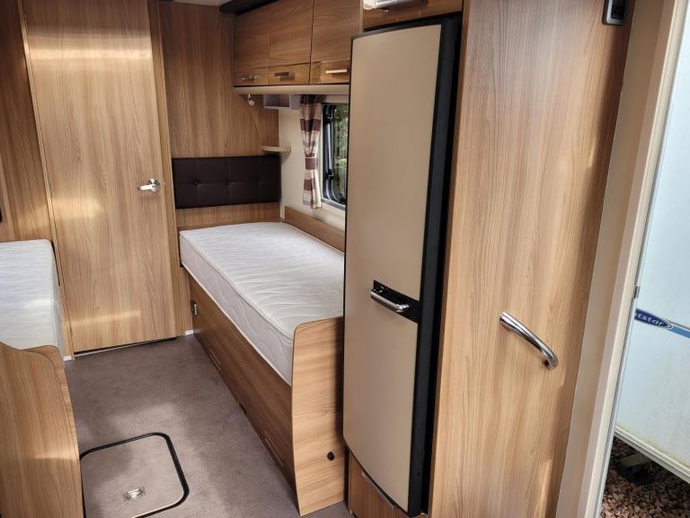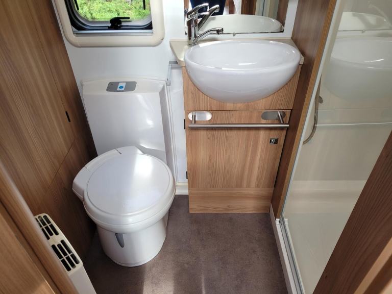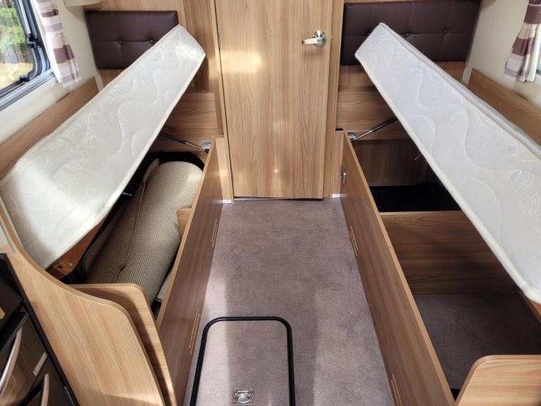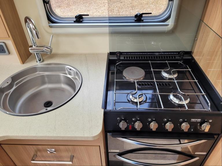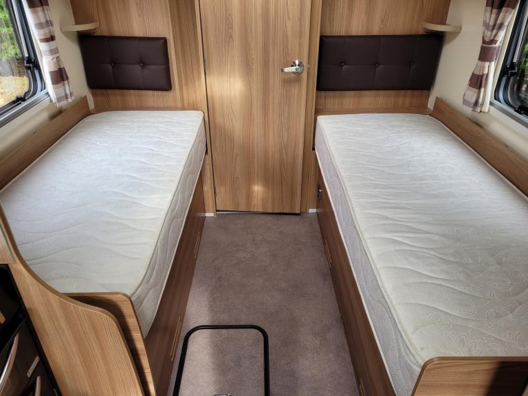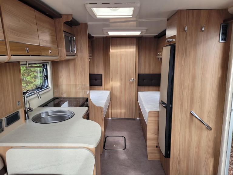 Spacious and bright four berth caravan, featuring the twin fixed bed layout. Bench seating at the front converts to a double bed, the centre kitchen area includes a full cooker, fridge and integrated microwave, whilst the end bathroom has a separate shower cubicle, vanity hand basin unit and electric flush swivel cassette toilet.