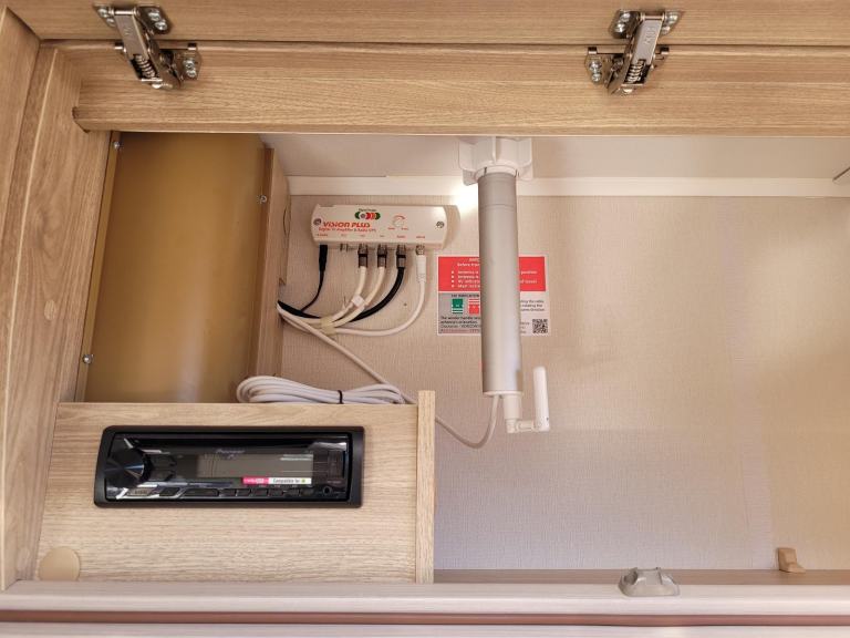 Sunroof; TV Aerial; Fixed Double Bed; Microwave; Cooker; 12V Lighting; Blinds; Grill; Double Glazing; Mains Hookup; Separate Shower; Sink; Oven; AM/FM Stereo; Hand Washbasin