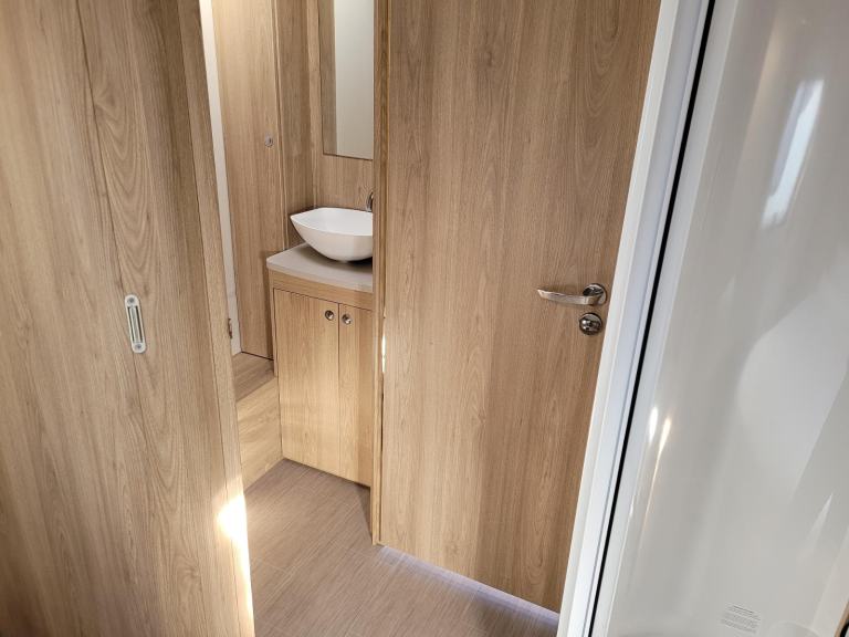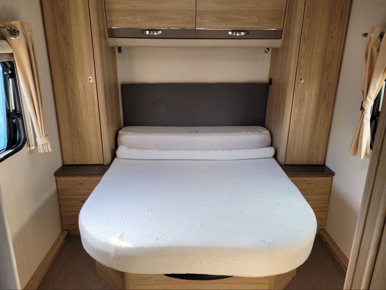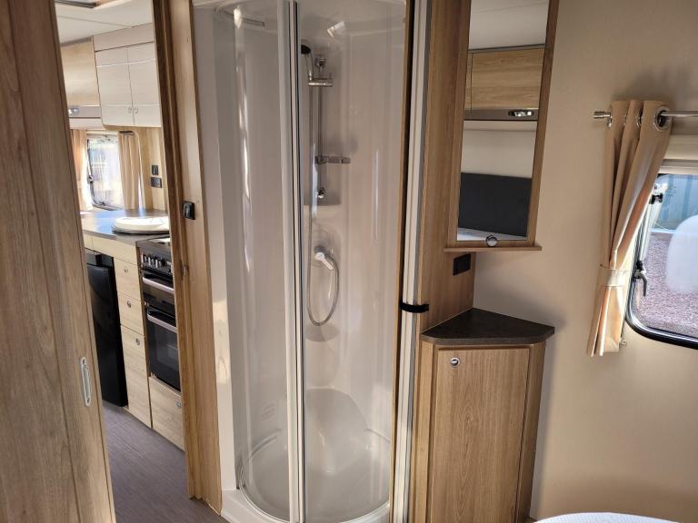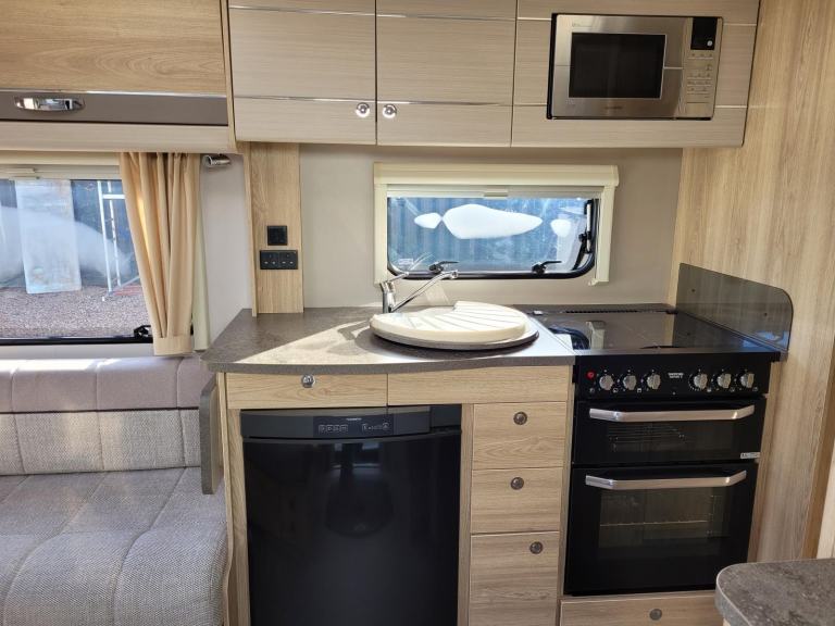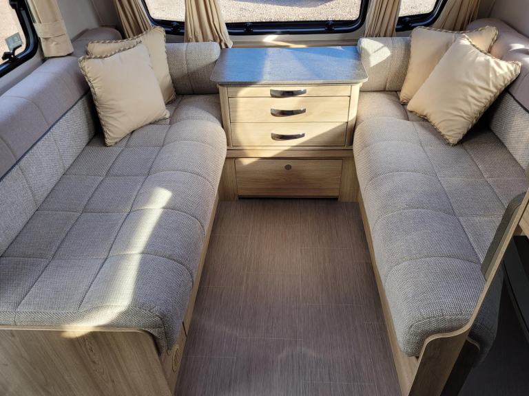 Spacious and bright single axle four berth caravan featuring the popular end bedroom with fixed island bed, bench seating at the front converting to an additional double bed, central bathroom area with a separate shower cubicle, whilst the kitchen has an integrated microwave, full cooker and fridge. Has the added bonus of a motor mover already fitted for ease of manoeuvring.