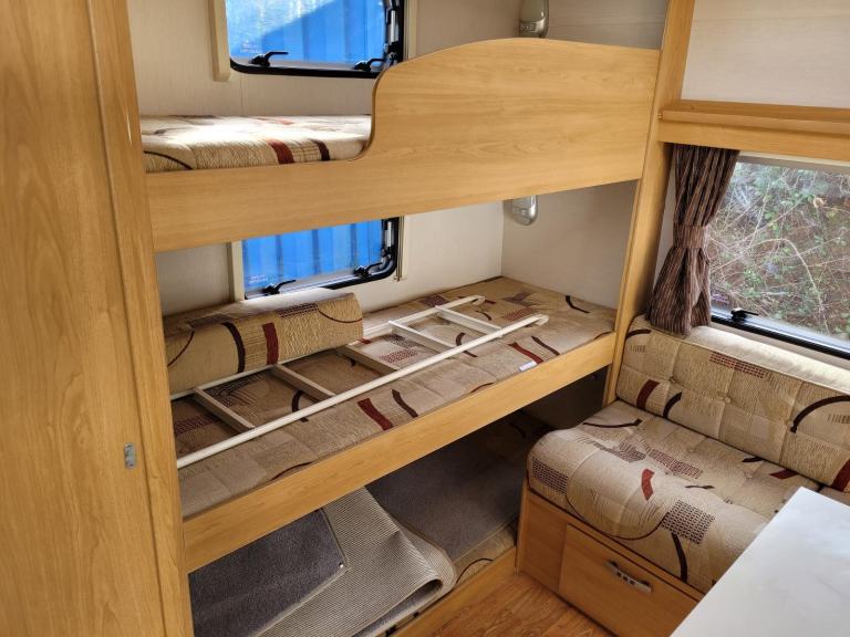 Spacious, single axle six berth caravan featuring a great family layout. Comprising of bench seating at the front converting to a double bed, end bedroom area with a roomy side dinette converting to a single bed and triple fixed bunk beds opposite. The centre kitchen area has a full cooker, microwave and fridge, whilst the bathroom opposite has a separate shower cubicle and swivel cassette toilet. Further benefits from a motor mover already fitted for ease of manoeuvring.