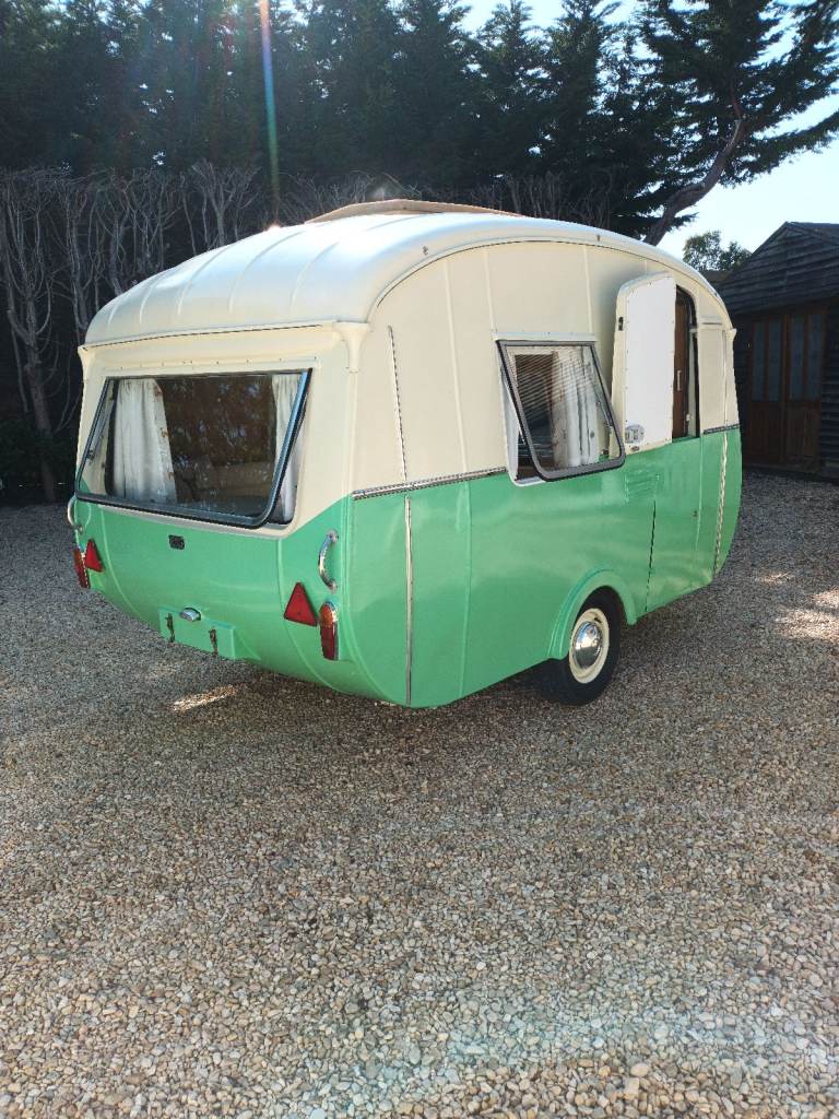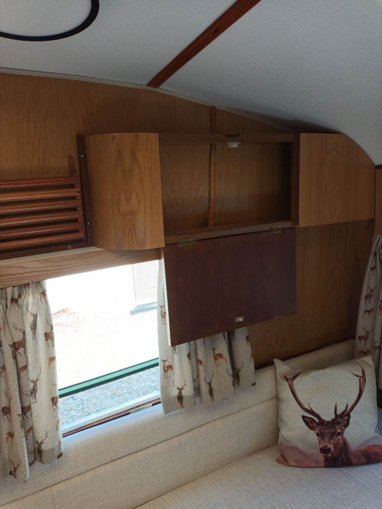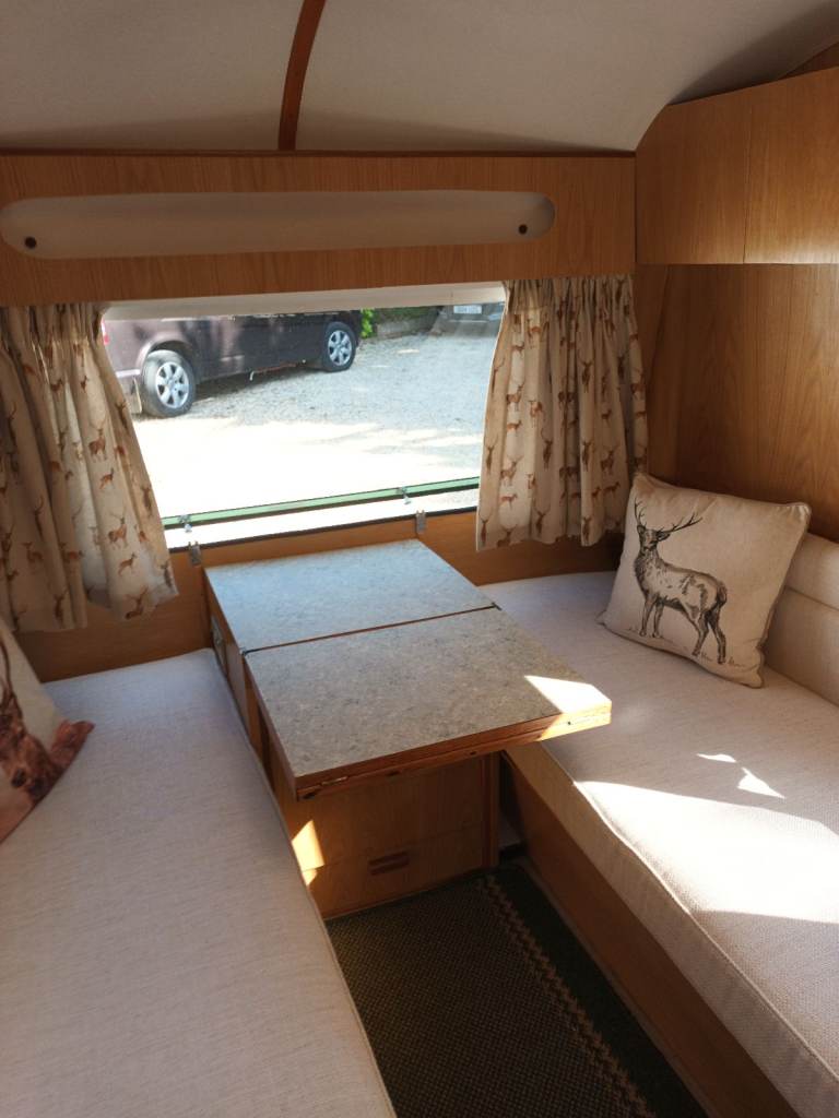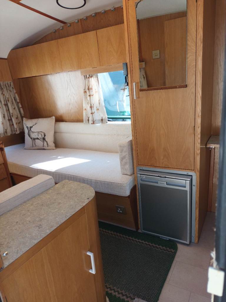 2 berth single beds cheltenham fawn caravan. Completely refurbed, all rotten wood replaced with hardwood, new buffurlow ply floor, 240 volt Electrics fitted [ plug in at home or campsite ] toilet compartment sealed off by byfold doors, gas hob,sink [cold water only] modern Dometic fridge fitted. [does require 12 volts electric to run it ]...Please note no 12 volt fitted. All walls and cieling have been replaced with oak venered ply/ painted ply. 5 lever deadlock fitted in bottom section of stable type door. Interior seat material is high quality John Lewis, with good quality sponge. Hand made curtains made from a deer printed material. The Exterior has been painted in High quality Marine paint .. cream/green. I have many photographs of the refurbishment which was completed 15 months ago... only used 3 times since then.