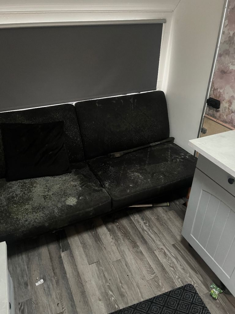 This small converted caravan with a fixed double bed configuration, kitchen in the centre and a sofa at the back. Small but spacious, tows very well and all lights working