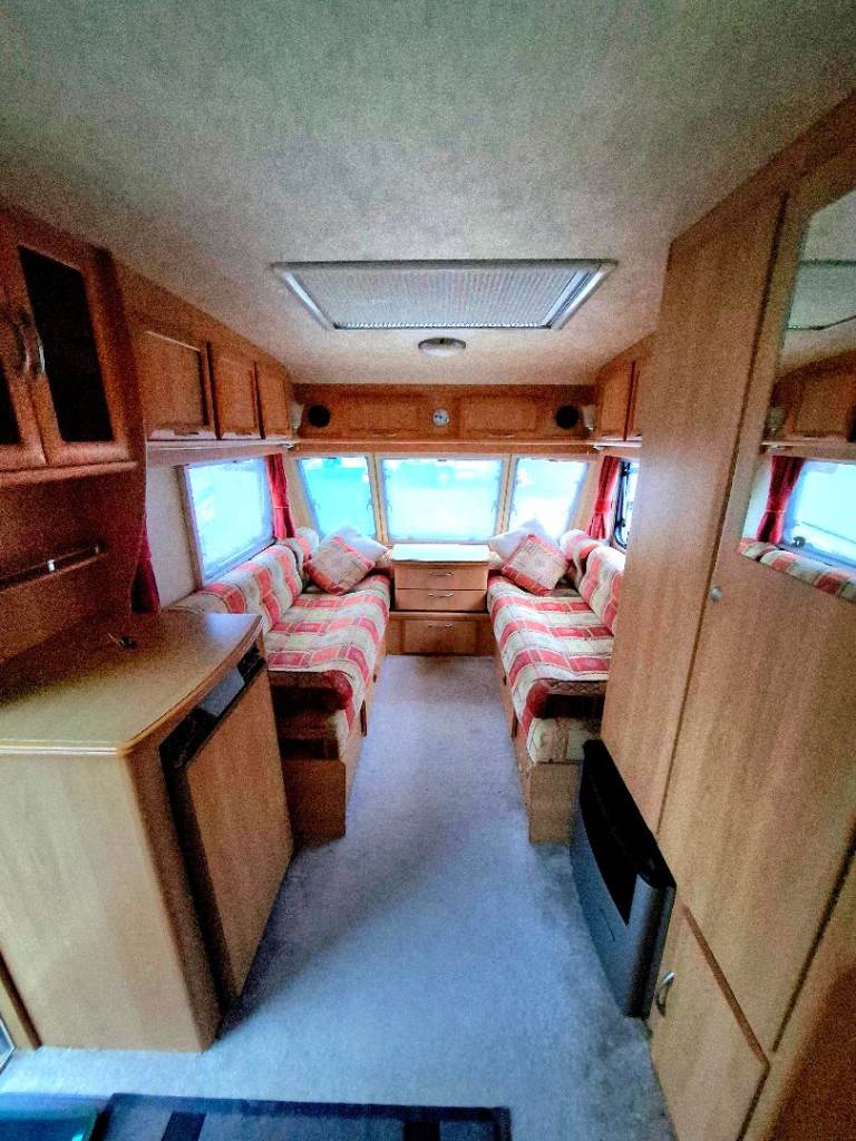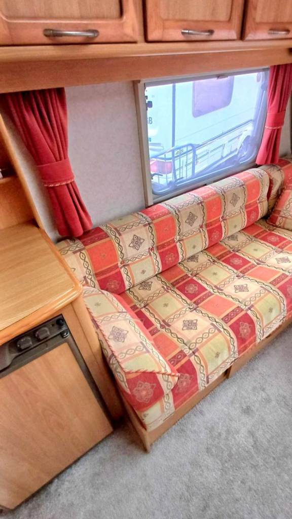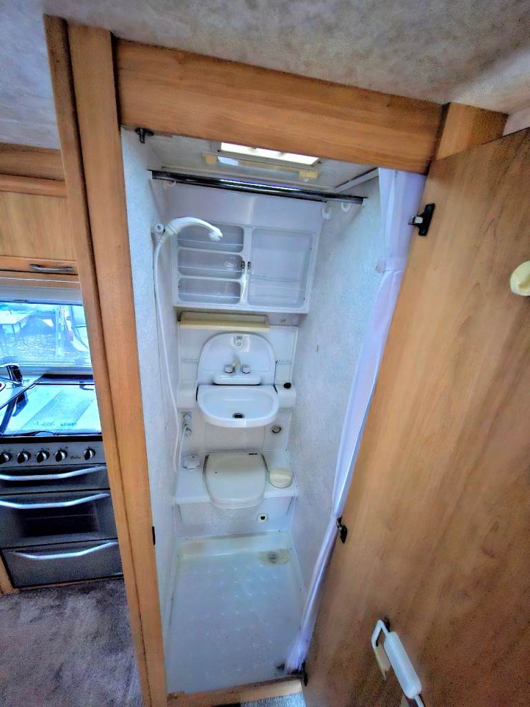Front lounge converts to a double bed. Rear L-shaped kitchen, and side wetroom with toilet, shower and handwash basin.