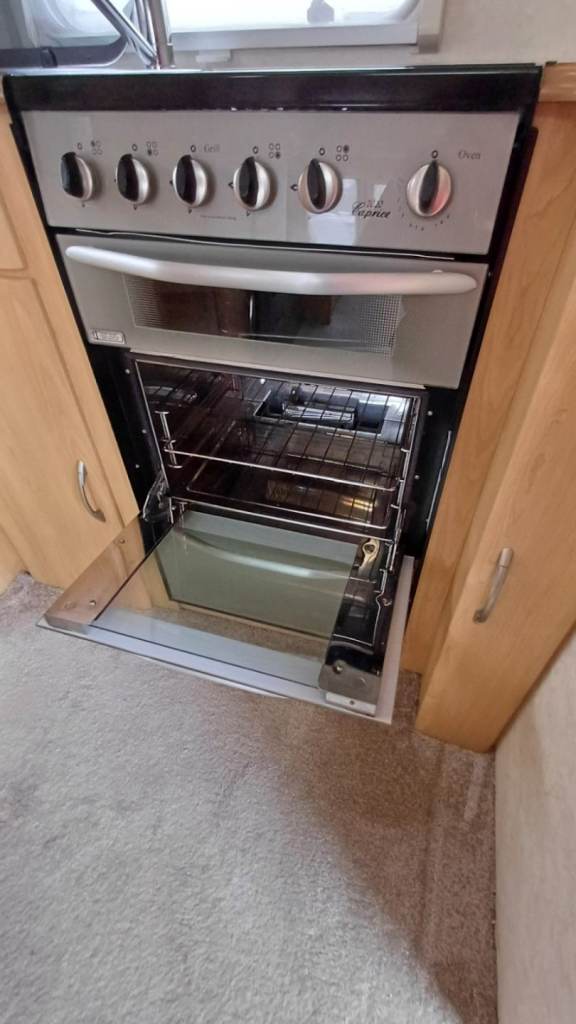 It typically features gas or electric blown-air heating, a fridge, a sink, a hob, an oven and a water heater.