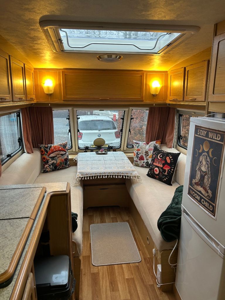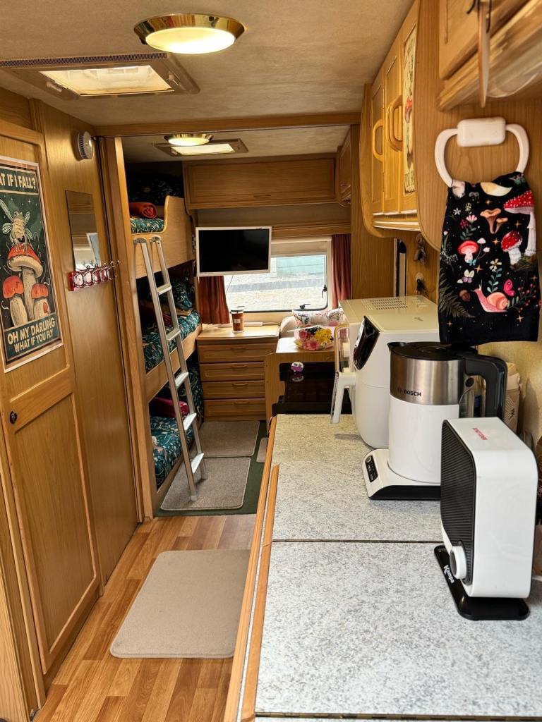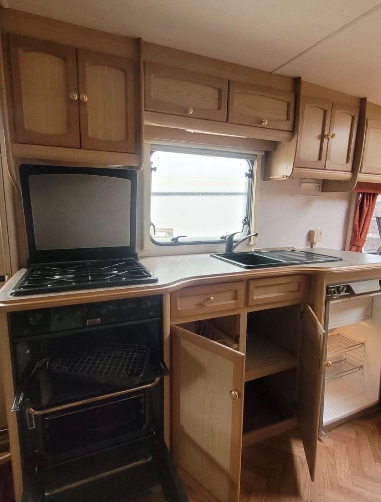 This is a cracking twin axle van, 3 bunk beds, a fold out single in the bedroom, the bedroom door slides closed for privacy.