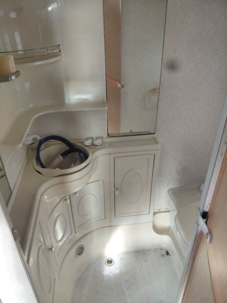 Layout: Front lounge with two bench seats, end kitchen, and rear corner washroom.