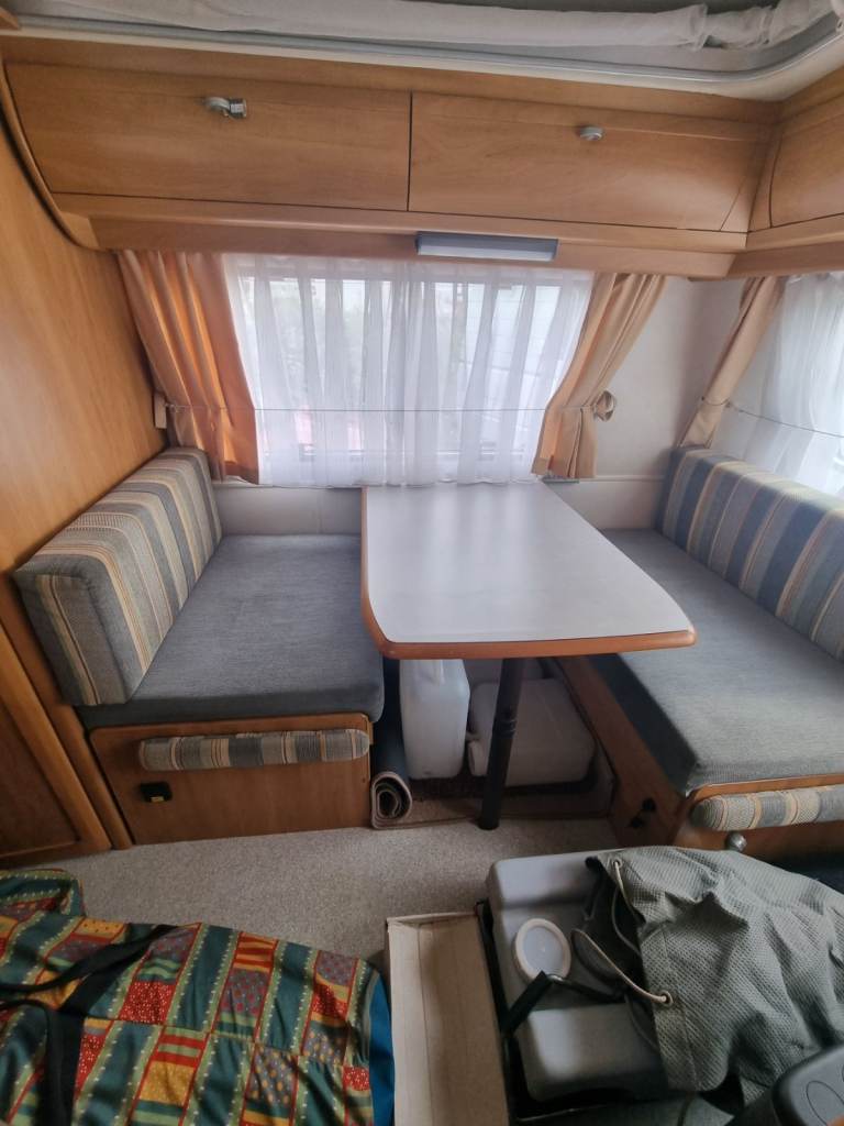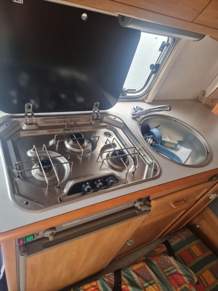 Fitted with a 3-way fridge with freezer compartment, separate 3 burner hobs. Cold running water, Truma ultra-heat room heater, with blown air. The lounge area features a comfortable dinette area.