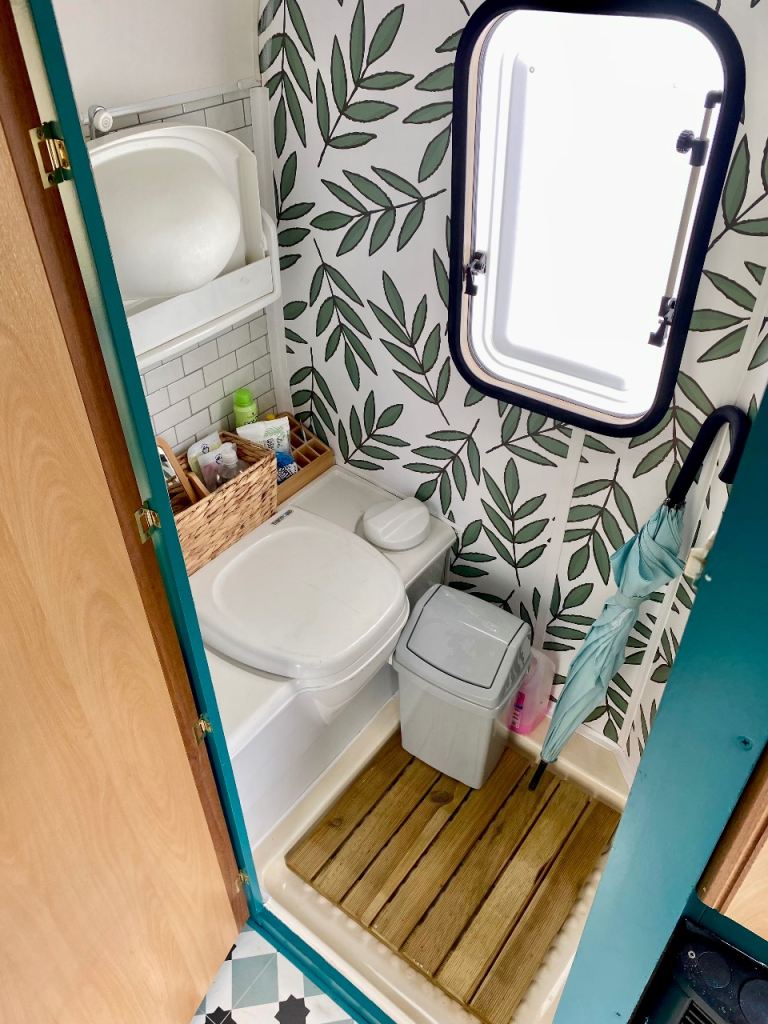 • We have taken the leaf pattern wallpaper off the bathroom walls.