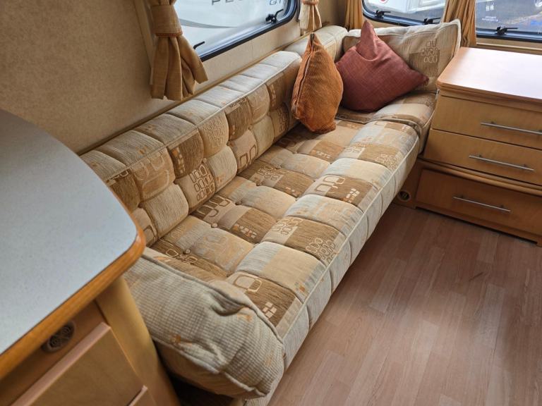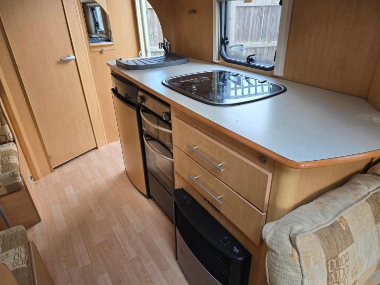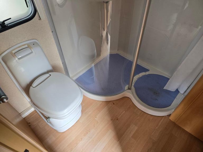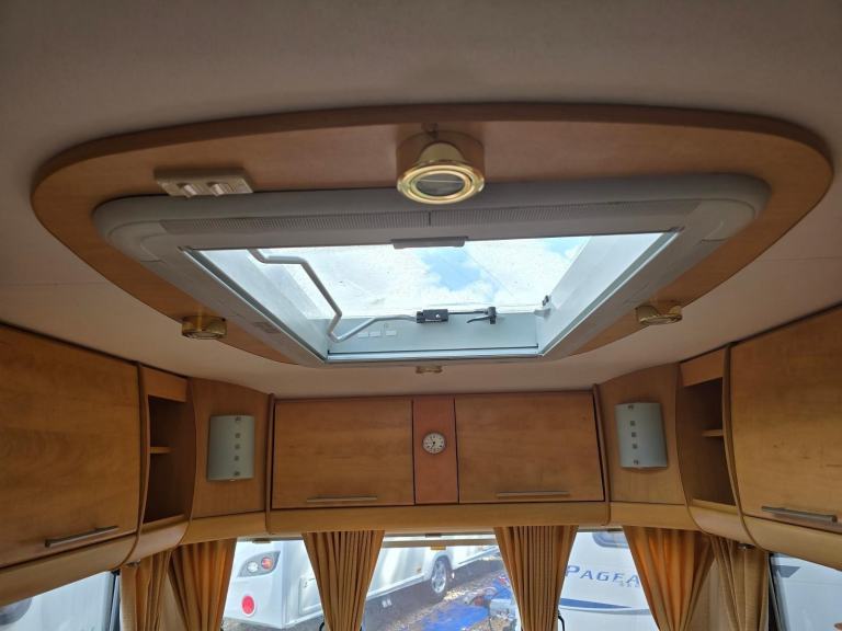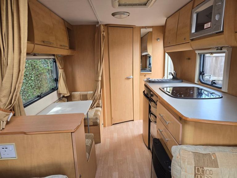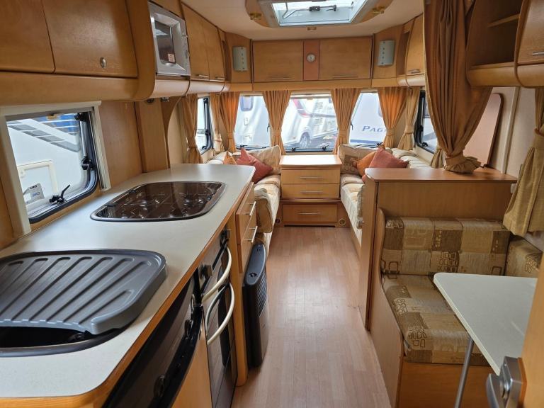 It has a 3 way fridge freezer, full oven, hob and grill, HEKI roof light, double glazed windows, blinds and nets on all windows, 12v and 240v electrics, truma heating system, stereo radio, digital tv aerial with booster box, gas fire, numerous plug sockets, removable carpets, separate shower, thetford swivel cassette toilet, sink with vanity unit, large wardrobe and lots of storage space.